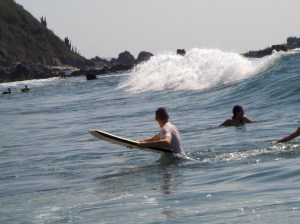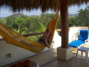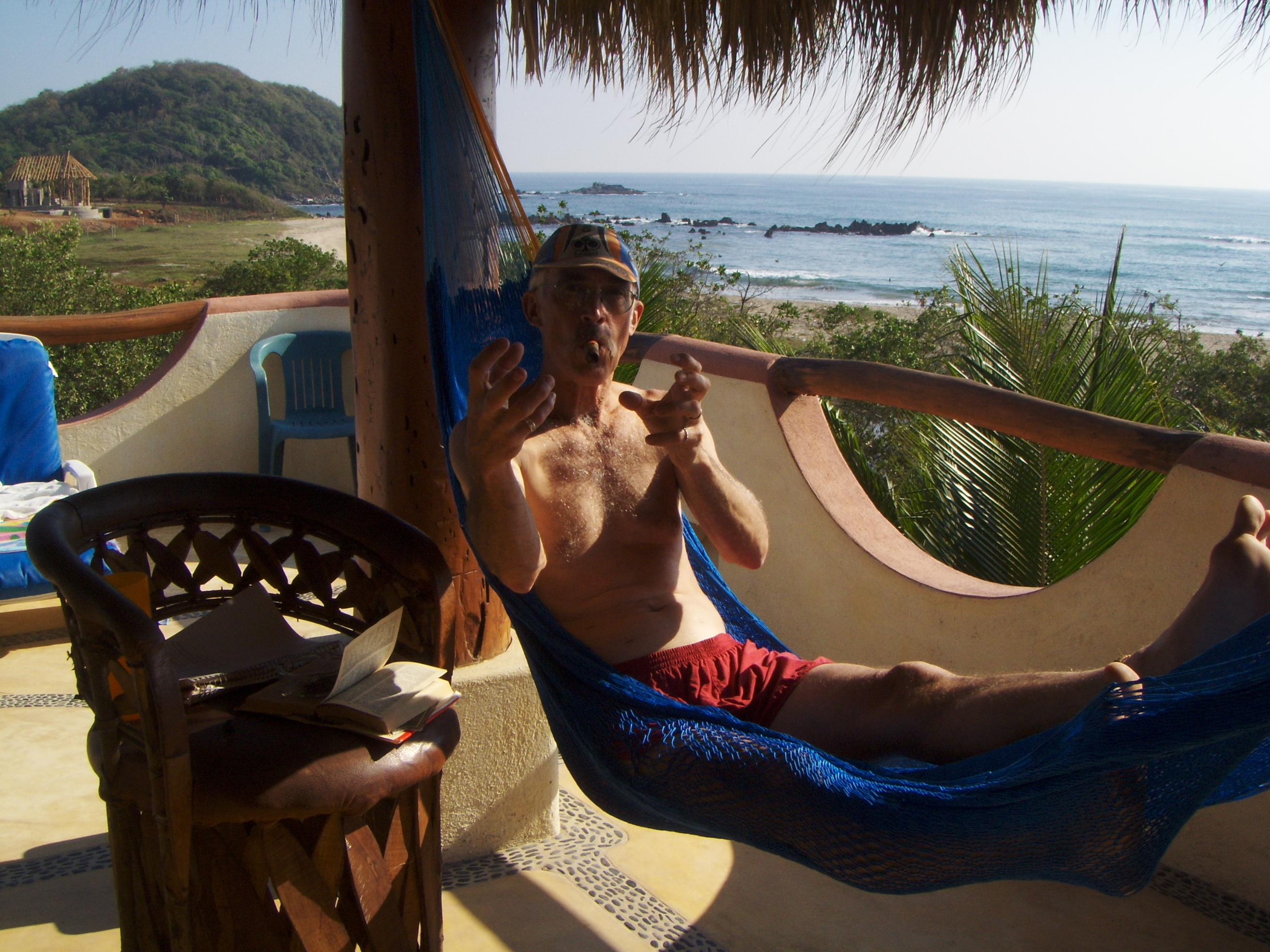 Hoy, vamos a Ixtapa (mi esposa llama “Zappa-Zappa” por los dos ciudades) por comprar (mas puros y cerveza, por favor) y tomémos almorzar. Entonces volvemos aquí y vamos mas “boogie-boarding.” Jugo en el agua tambien pero no “boogie” para mi. Ahorita, porque estoy en una hamaca levantado/arriba de este casa, espero que cena esta preparando.