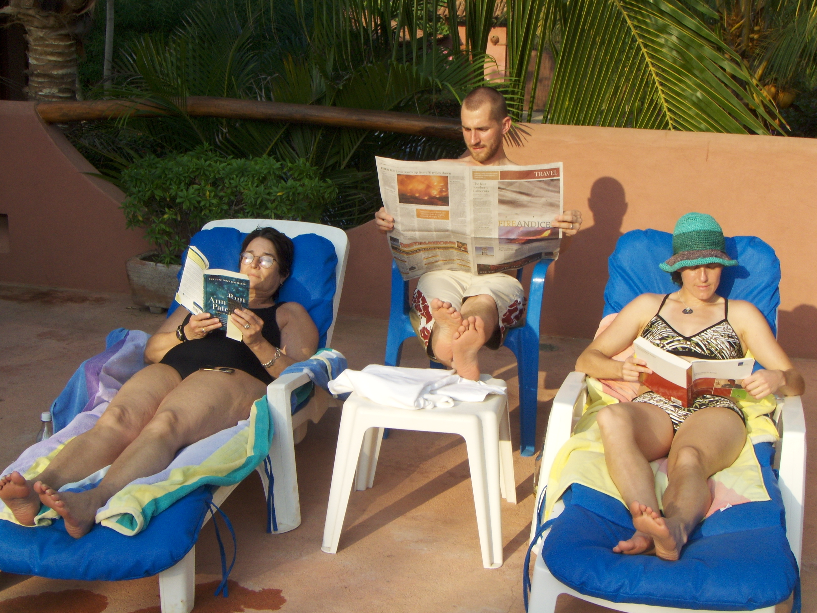 Esta tranquilo ahora. Estamos todos cansados, pero prontamento vamos a cena por cumpleaños de “D.” Todos fuimos “boogie-boarding” hoy, excepto yo. Estuve golpear por olas de mar dos días pasado.