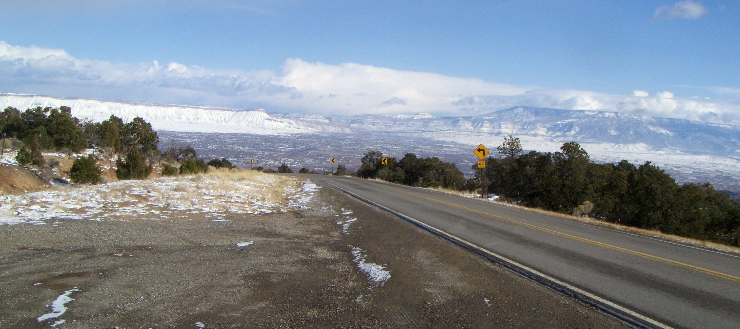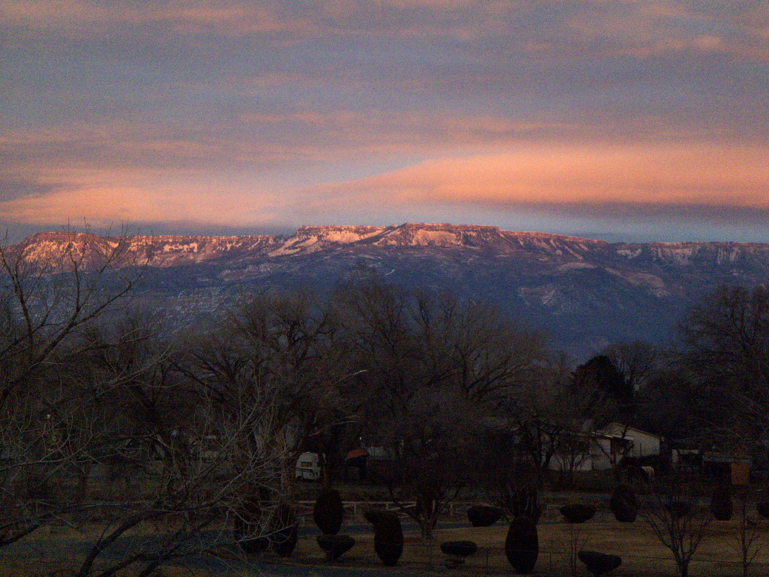 And … to the west is the Monument. A monument unto itself, probably soon to become a Nashunull Park, a sort of advance hint of the vast Utah Canyonland red-rock (and green- and yellow- and gray- and orange- and brown-rock) spires, hoodoos, sheer river-carved movie-screen walls, badlands, and much-coveted raft-trip camping areas. Ah, yes, the Monument. The high points of which approach 7,000 feet — high enough to be a viable companion foothill to any of Colorawdough’s grandest peaks, yet merely the edge of the northern rim of the Uncompahgre. The sunlight does quite a show with the Monument’s walls as well. A marvel at sunrise. Muted at sunset, where one’s attention turns either to the Bookcliffs or the Mesa, as the sun at one’s back makes looking down-sun, more … inevitable. Easier.