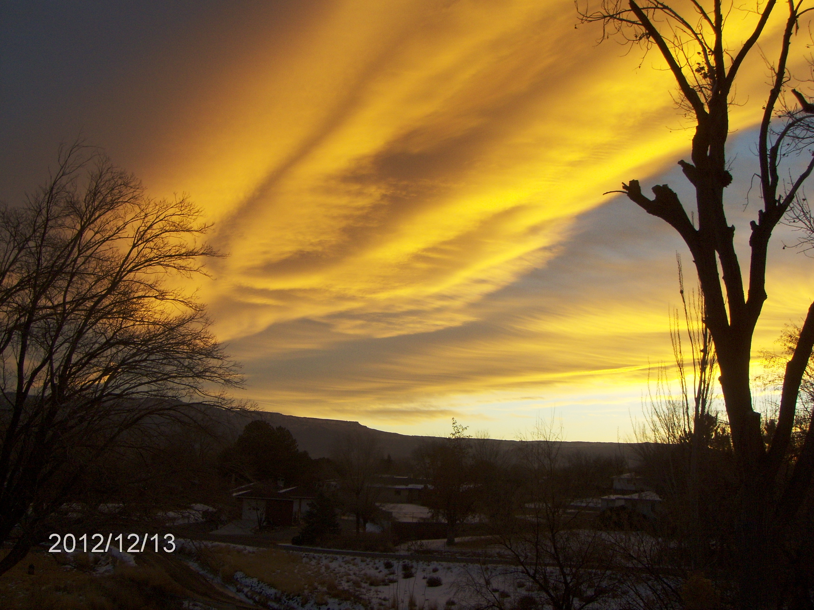 I’ve rarely dwelled on this, much, but … I do, indeed, live in a location which is just about as optimal as can be. Granted, I don’t live in an alpine setting, where majestic granite-faced peaks are the vista du jour. Hillsides covered lushly with a pine mantle, the four distinct seasons coloring the background (uh, desktop) of my life with distinct palettes every few months. I don’t look out at the Himalayas, where I suspect such grandeur would gradually become … mundane. Typical. Nor do I gaze out at the changing cloud composition and hues over the ocean. Good thing I don’t live in places all-too-easy to make fun of. Granted, during my three-month sojourn in the middull of Texas, the sunsets often were amazing. The sky there went from the flat distant earth’s-edge-line up and up to higher than possible anywhere else. Filled with clouds, of all colors.