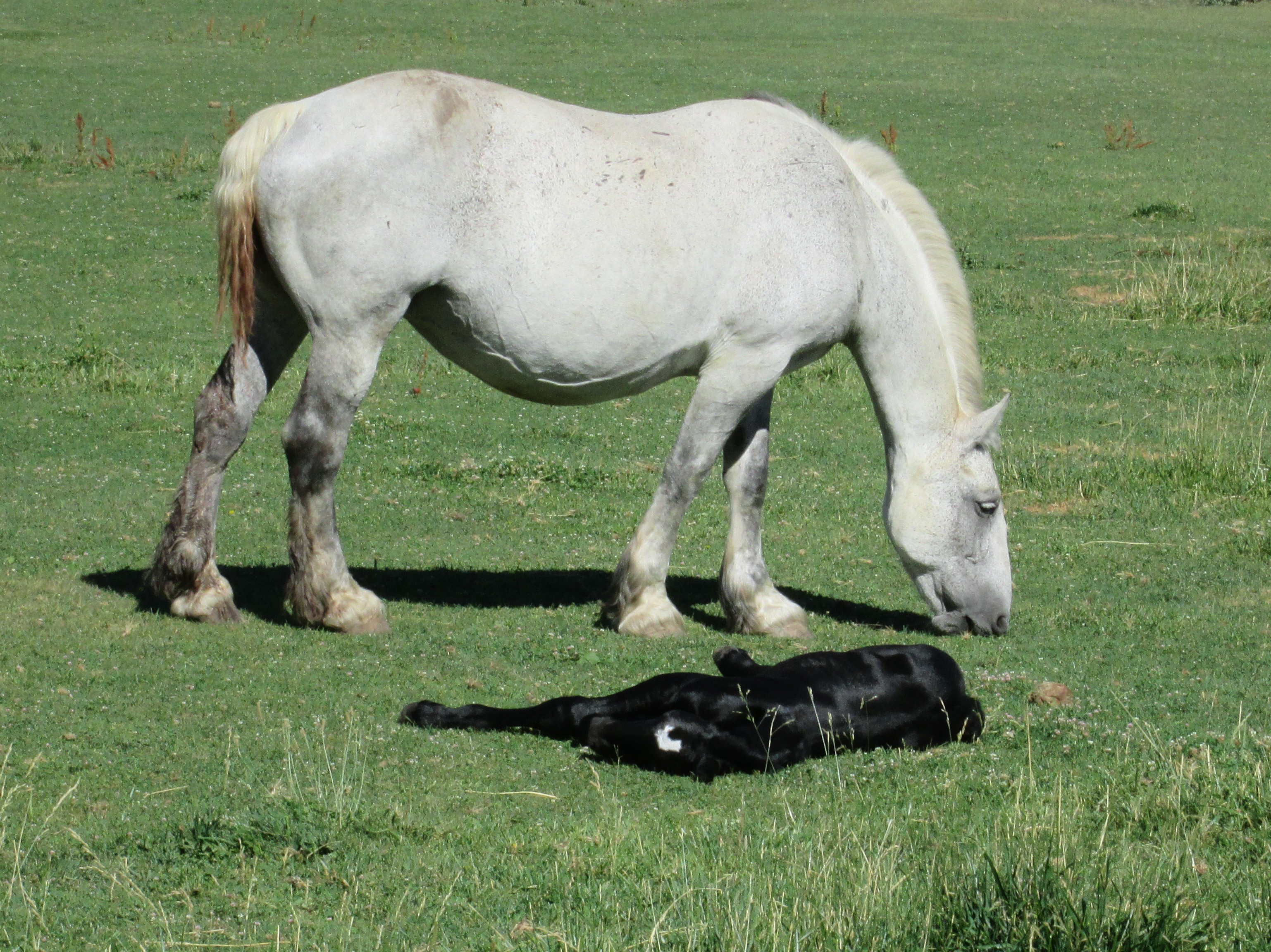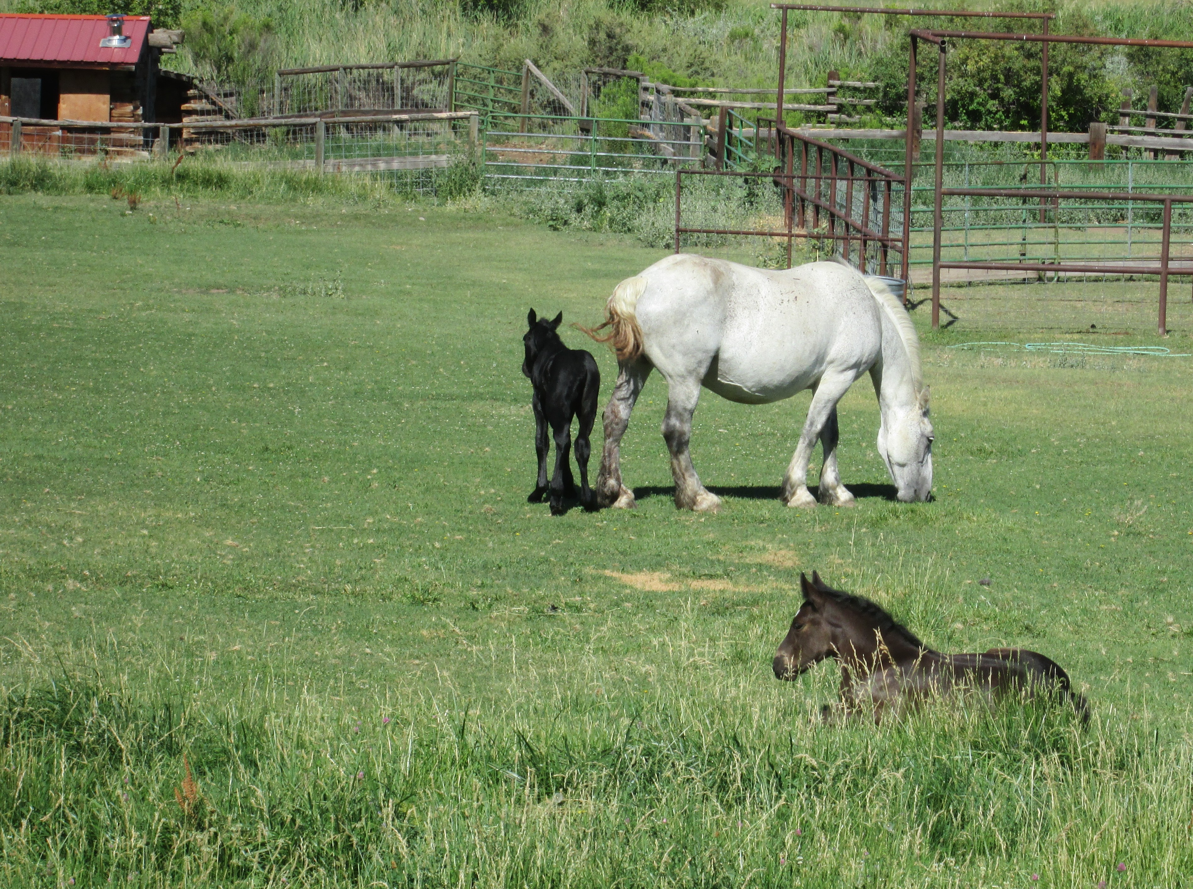 Driving from the job site, I passed the ranch owner out irrigating a field. He corrected me on the Clydesdale misconception, and explained why the foals were dark. He had bred his two Percheron mares with a Belgian stud. I don’t know if the mares visited dad, or dad visited the mares, or perhaps things were facilitated by an icy package through the mail.