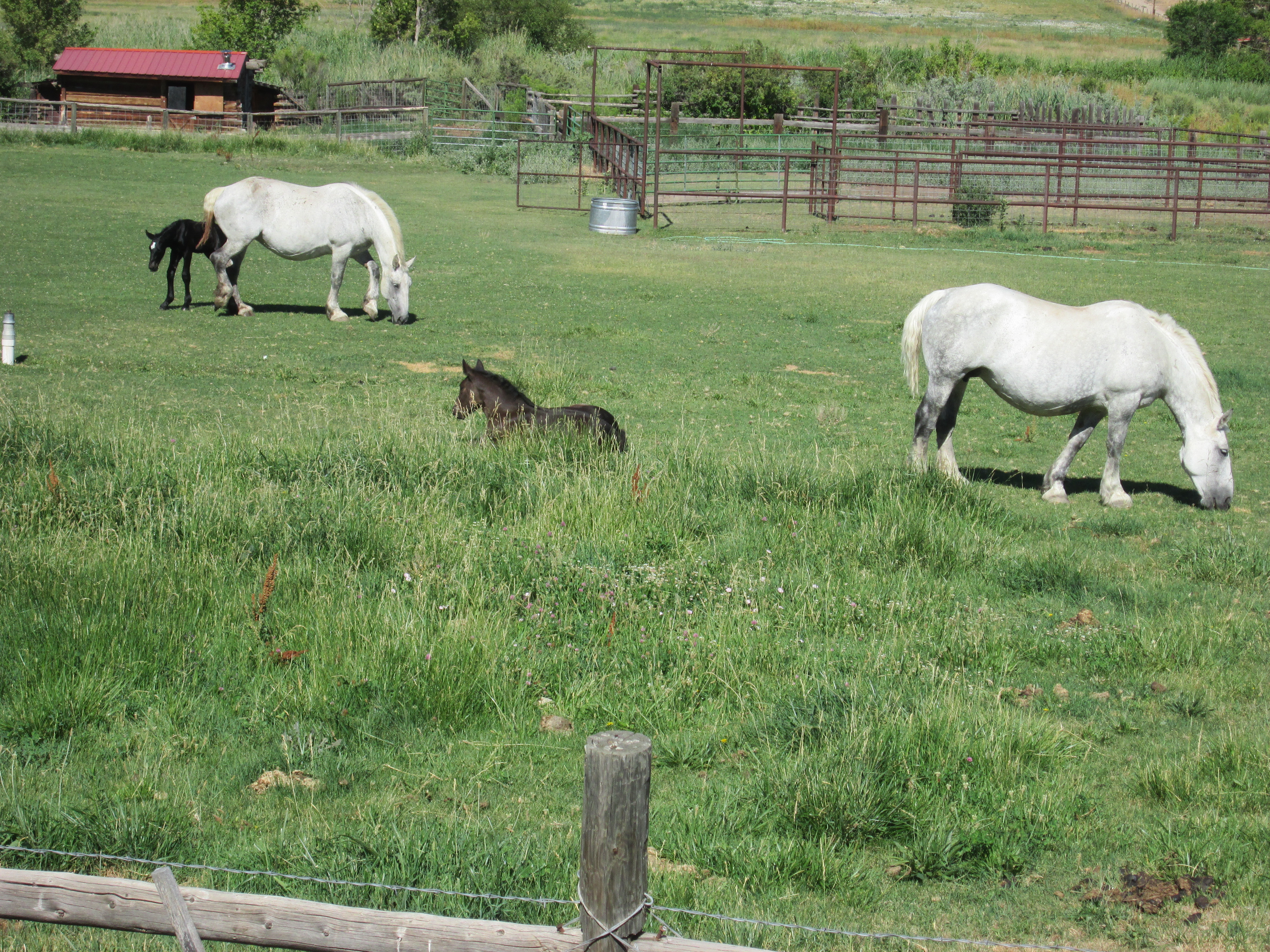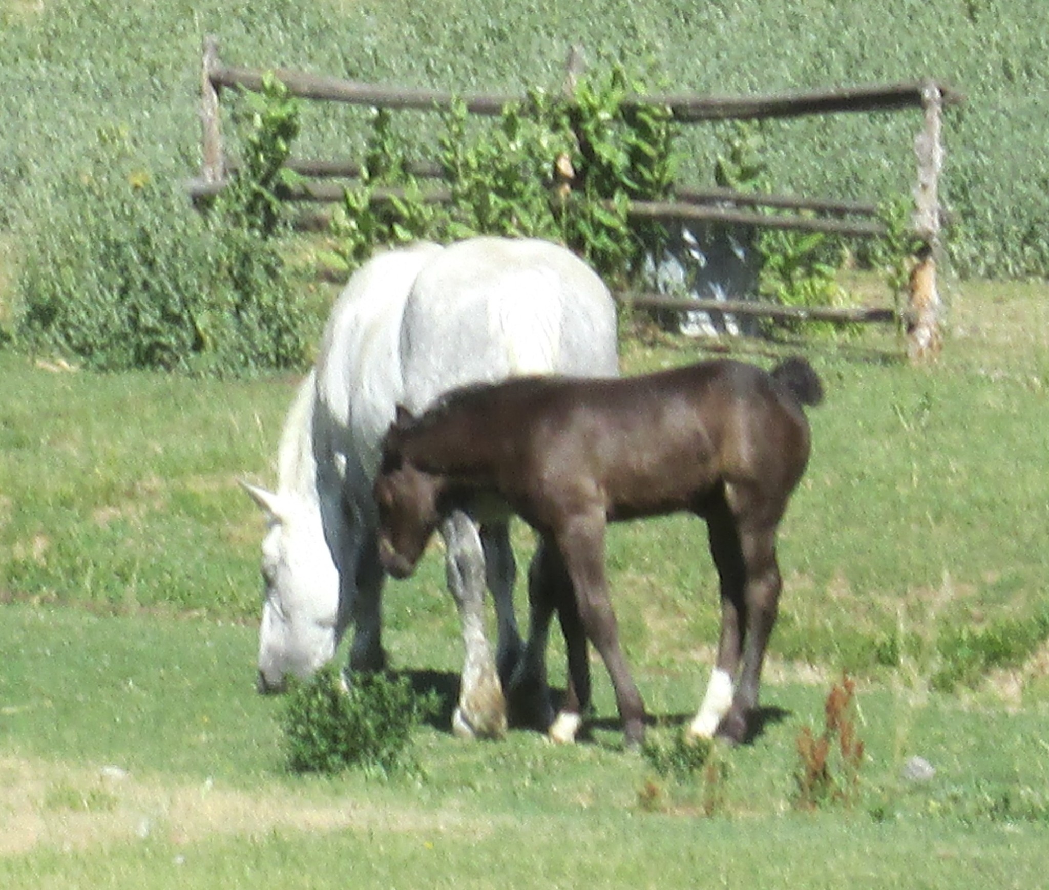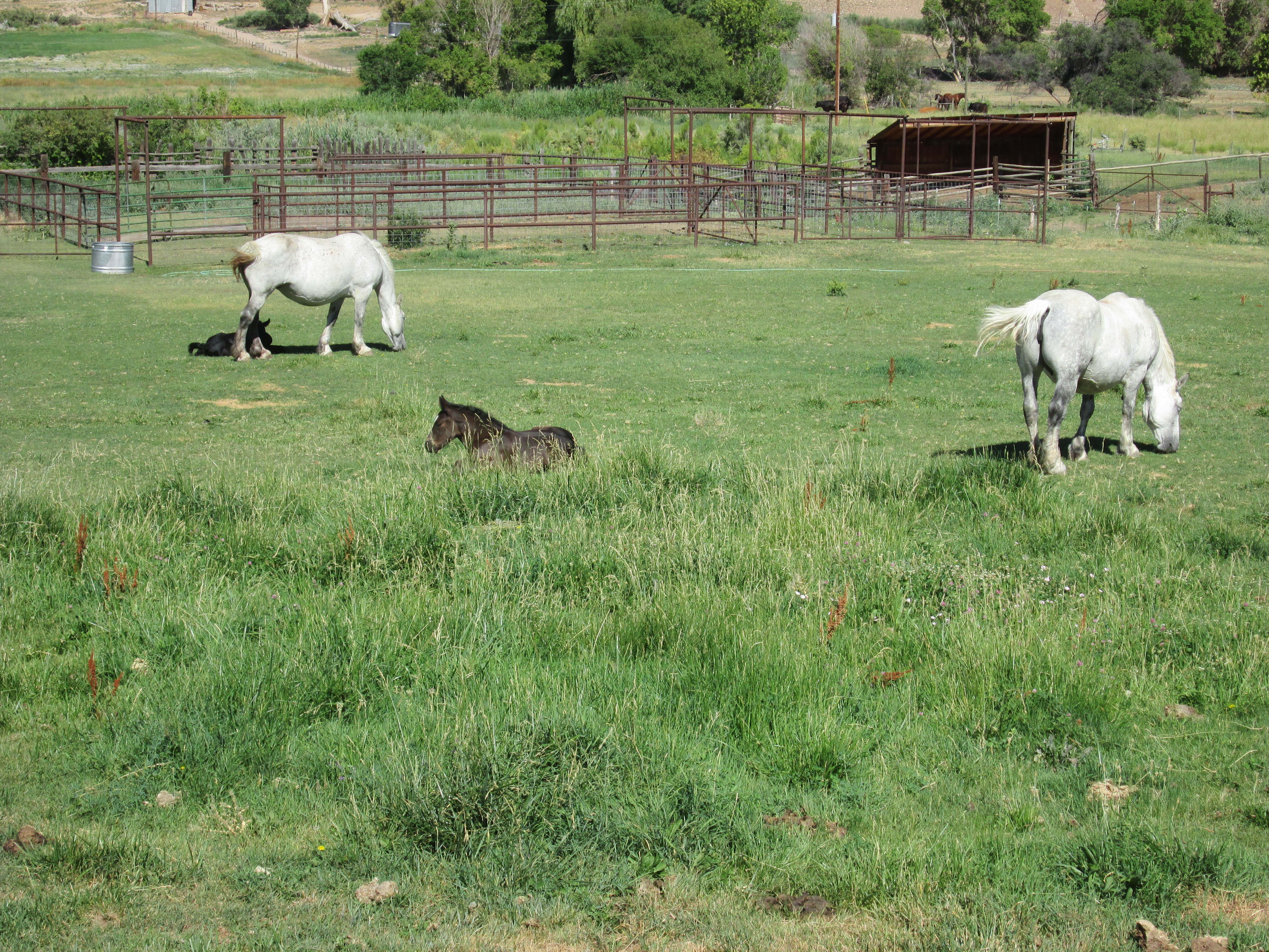View to the north-northwest, the “JQS” part of the Roan Plateau. We see a horse in an adjoining pasture wanting a closer look, or sniff, contact probably, with the new arrivals. Not shown are the occasional posturings of the mothers, ears flattened, teeth bared, chasing those who got too close away from the fence. Yeah, I’m gonna go back and check on that wellsite a time or three, yet.