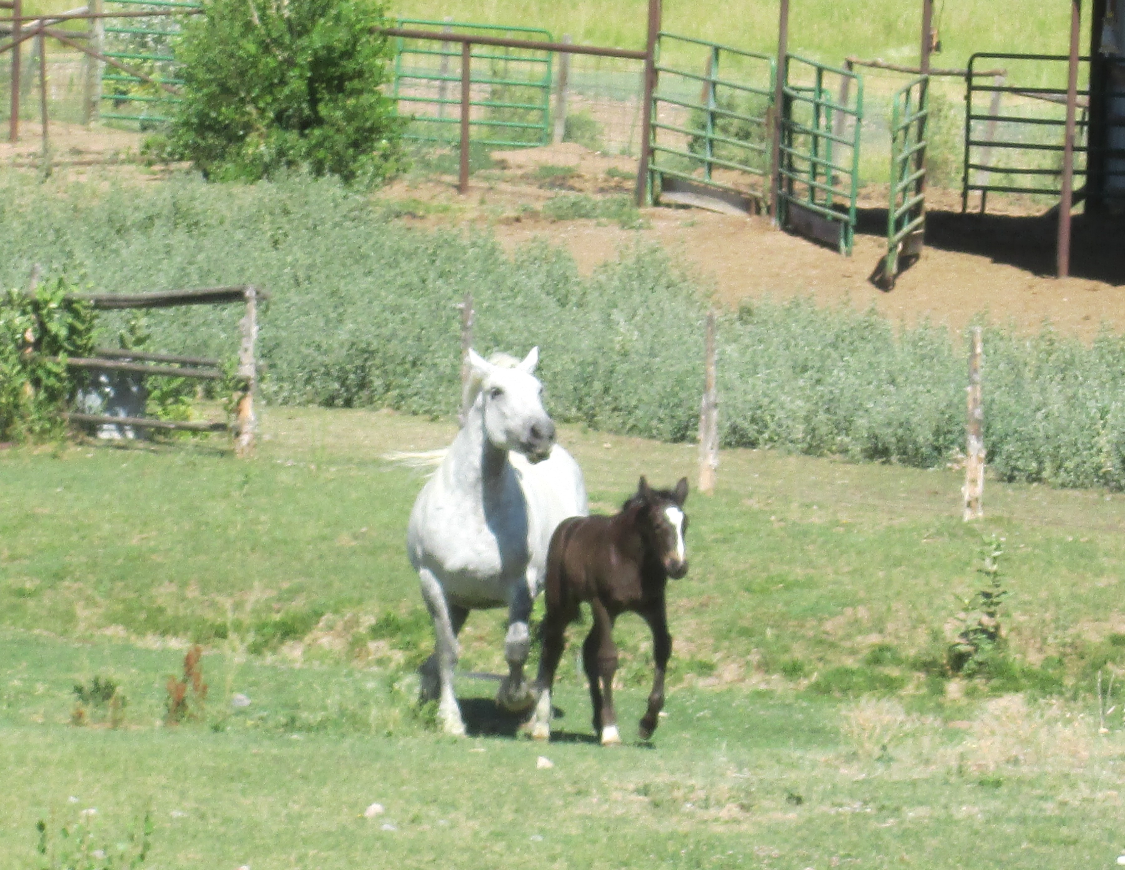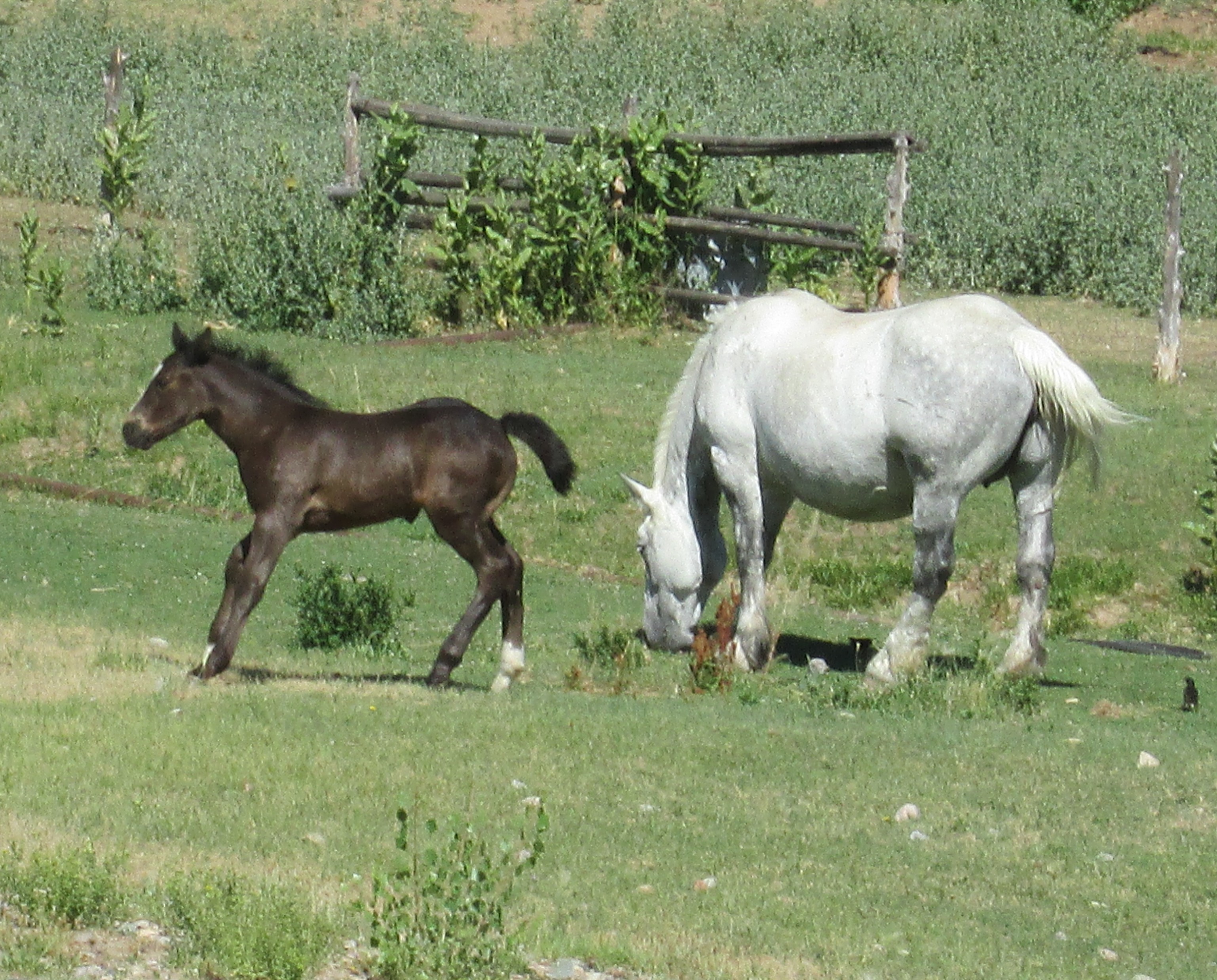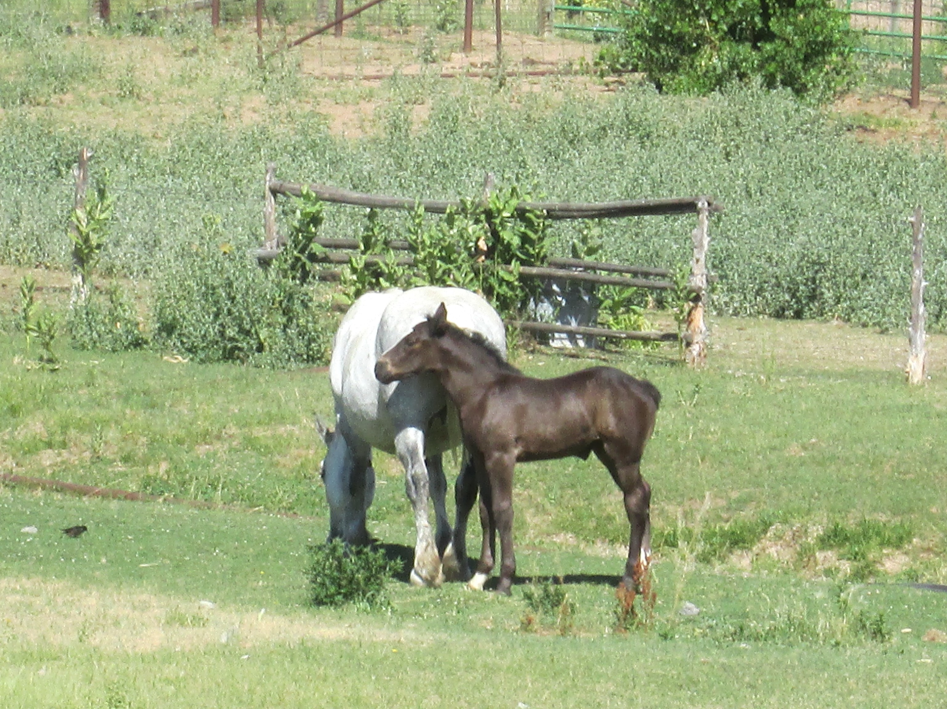 View to the north-northwest, the “JQS” part of the Roan Plateau. We see a horse in an adjoining pasture wanting a closer look, or sniff, contact probably, with the new arrivals. Not shown are the occasional posturings of the mothers, ears flattened, teeth bared, chasing those who got too close away from the fence. Yeah, I’m gonna go back and check on that wellsite a time or three, yet.