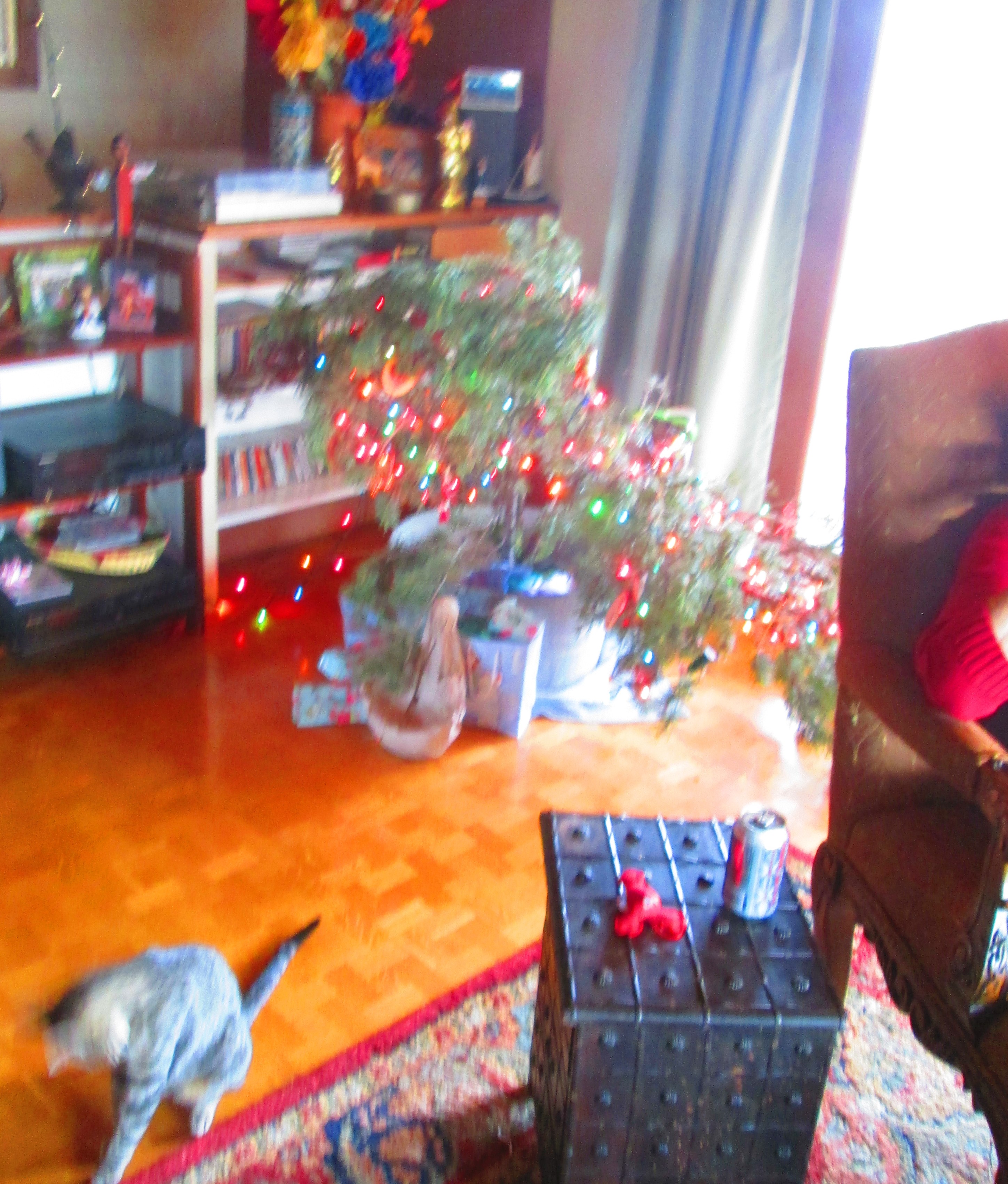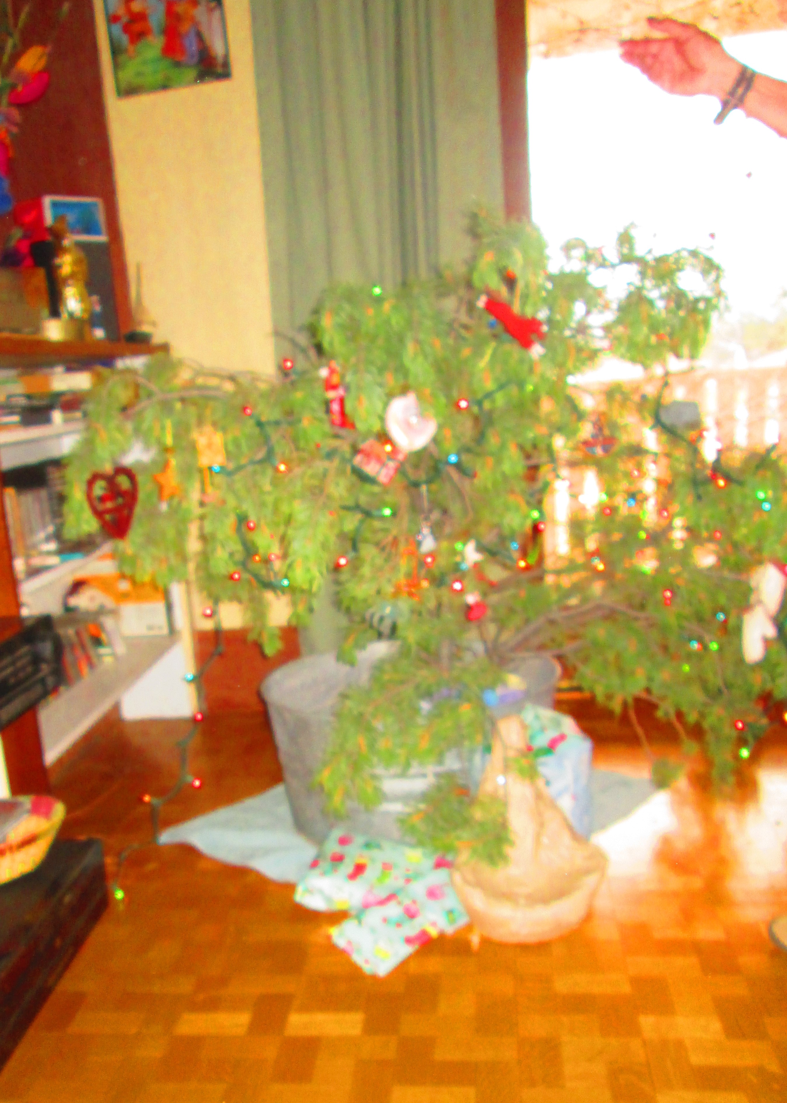 Eddy and Henry (our 4- and 2-year-old grandchildren) will be by in a few daze.  They probably will feel so over-whelmed (actually, under-whelmed is more likely) by our house in general that they won’t particularly notice the tree, uh, ahem, bush.  And when they do notice it, it still might not stand out in the over-all scheme of entropy and chaos our place will be perceived to be.