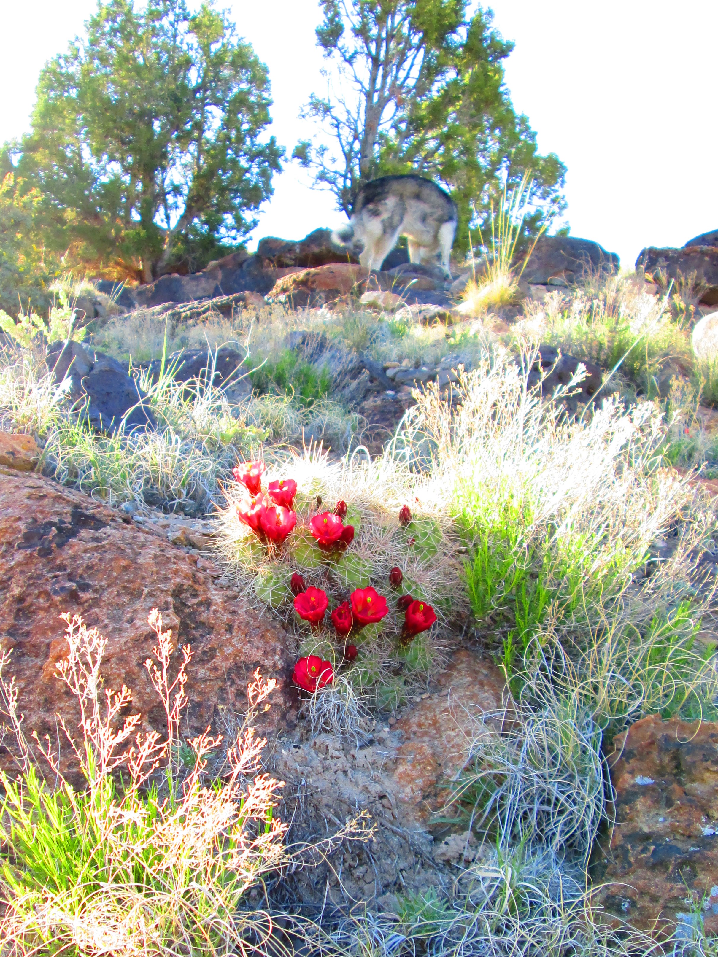 We (me ‘n 3 dawgz) hike up north from the road into Bridgeport. The cactus is in bloom!