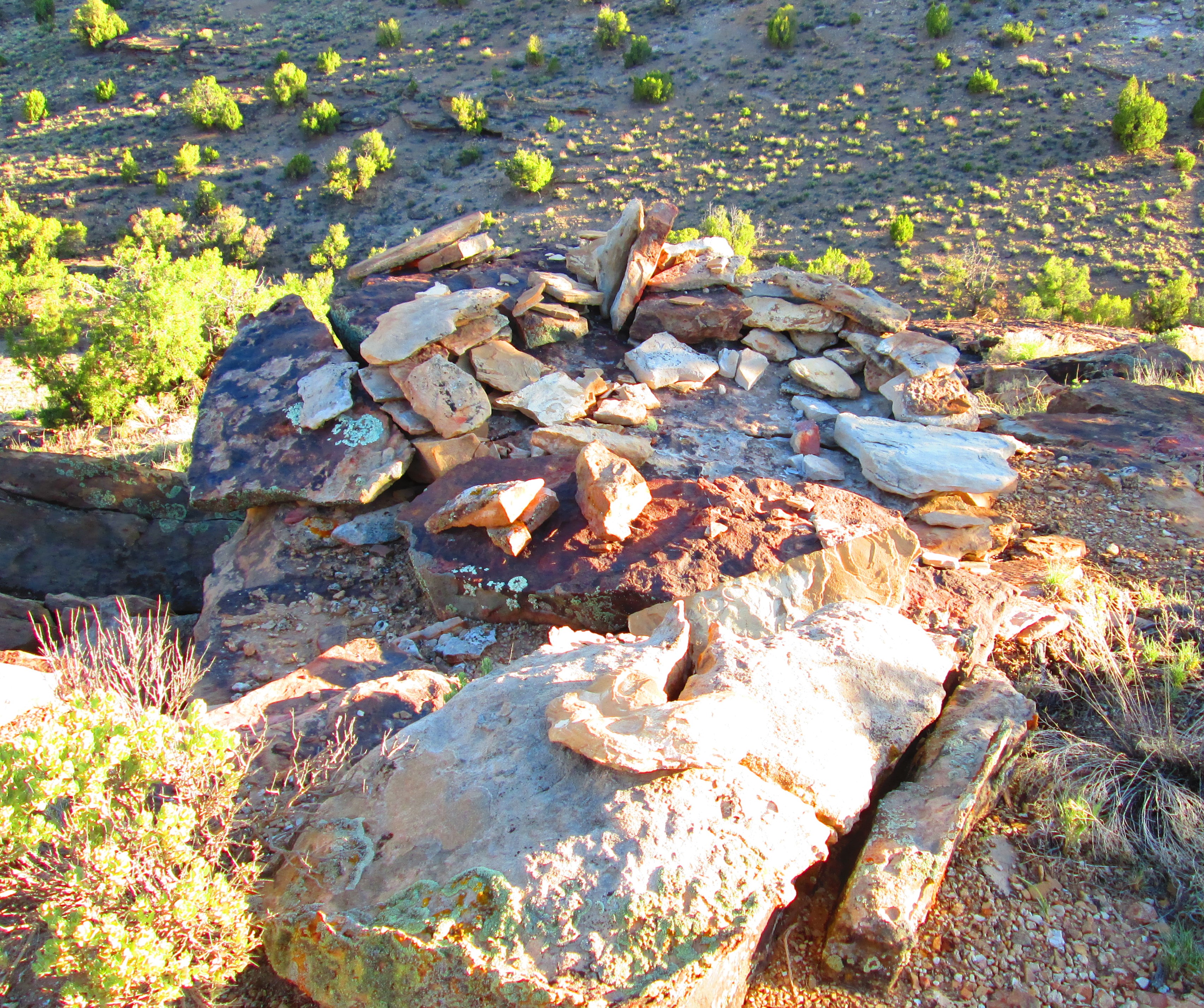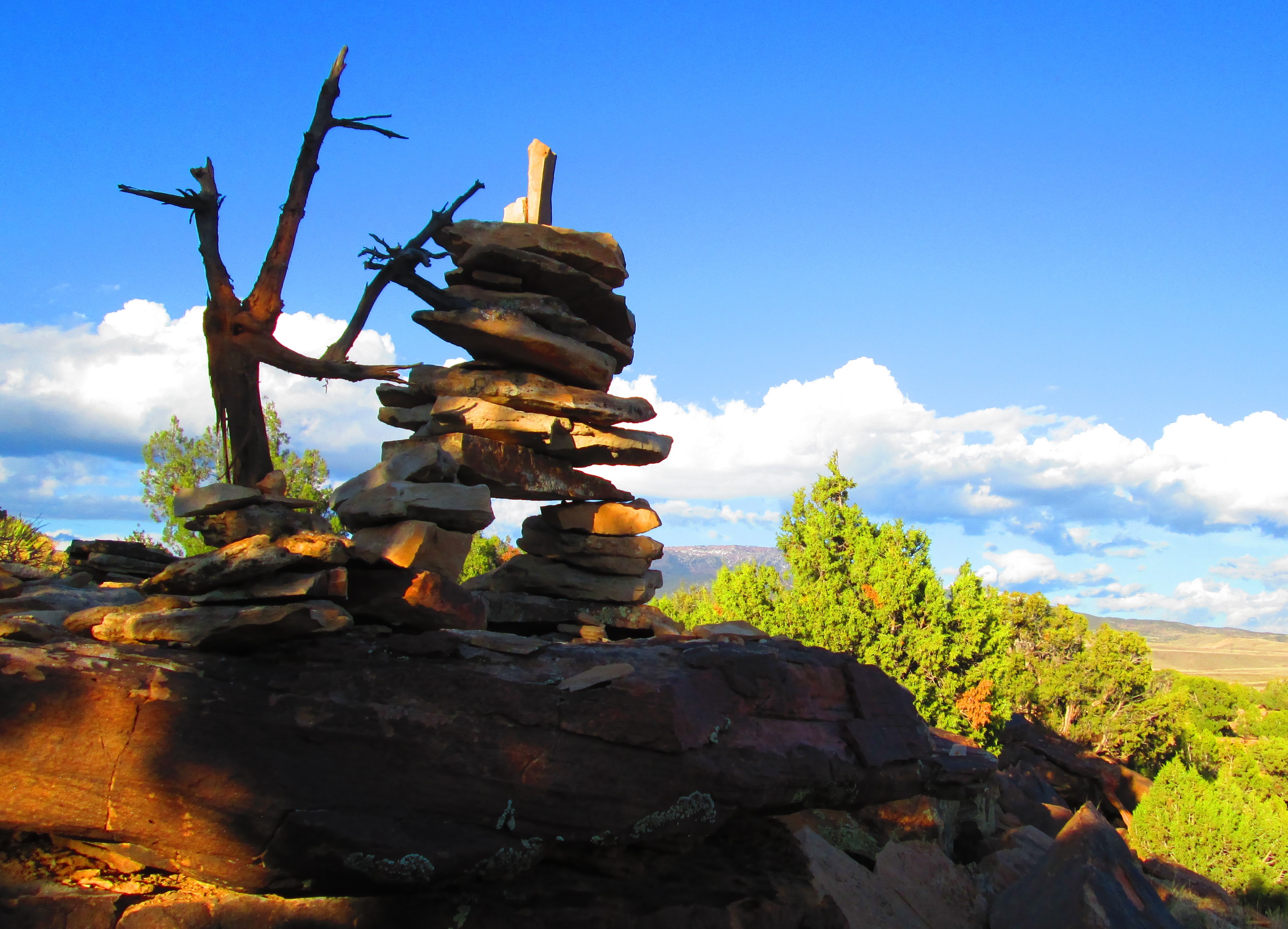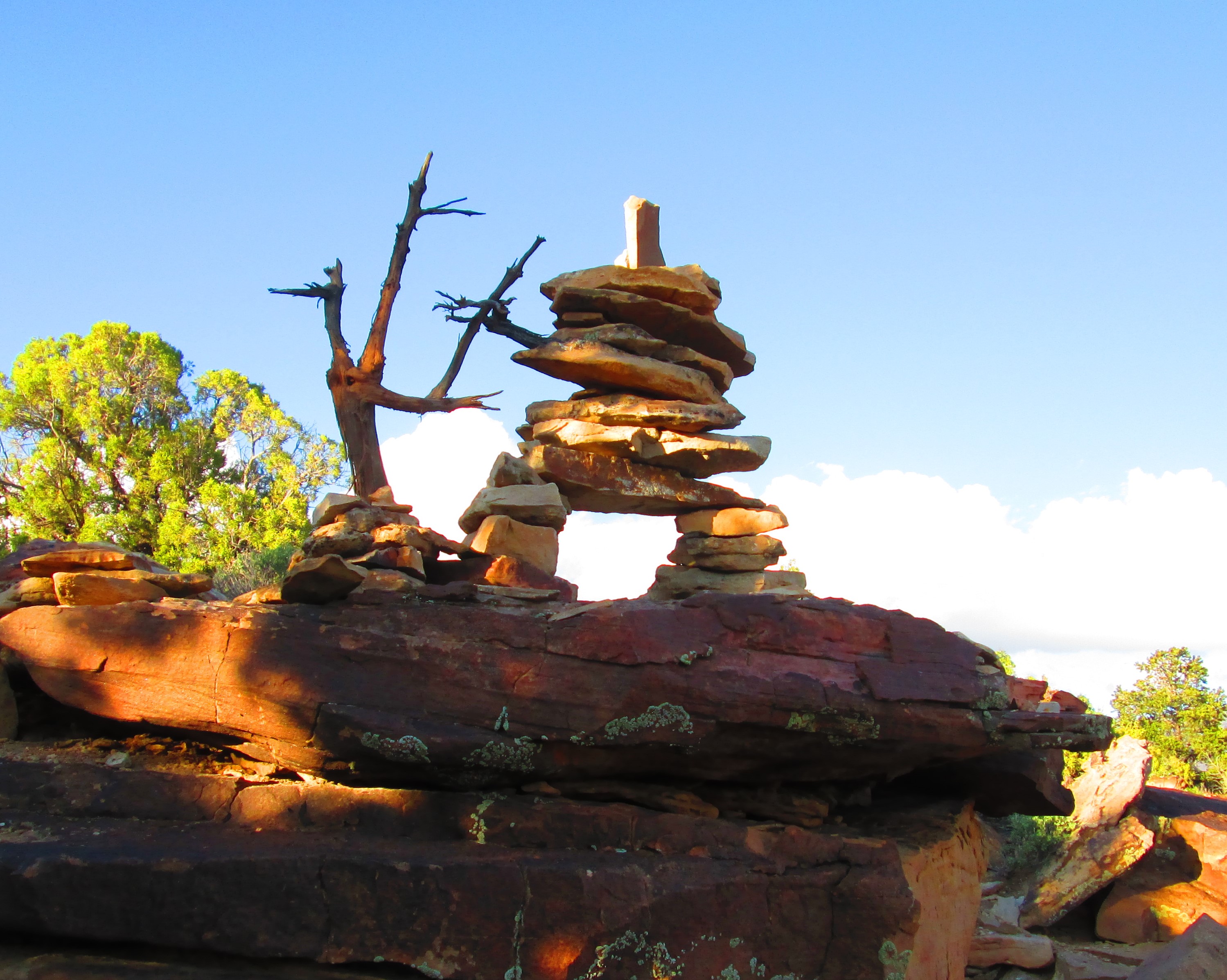Yes, I decided during a recent Sojourn in the Stinking Desert with the dawgs — that the rock-creations constructed by my hand and questionable esthetic sense and design were perhaps not similar enough to those fashioned by genuine Inuk-whatevers made by Real Native Artists. Crude, shoddily balanced, rarely (if ever) elegant, these (my) things were more likely to have been made by orangutans. So what would we call them?