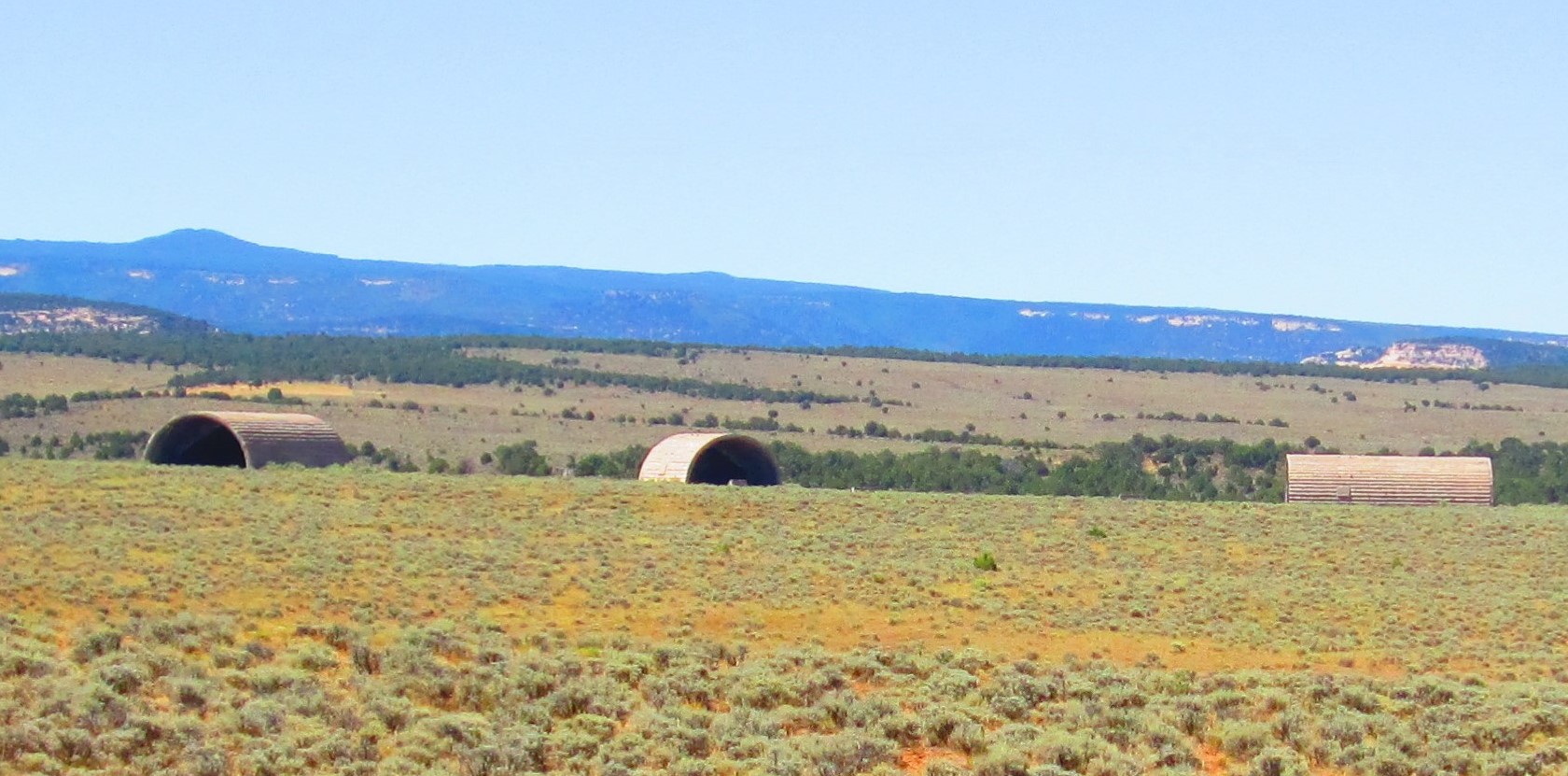 Below: recently we drove by the (allegedly WW2-era secret) Silos of Mysteriousness, in Glade Park (Colorawdough).  Our pixure don’t do them justice — constructed of concrete, these are relatively HUGE — 50 yards or so in length.