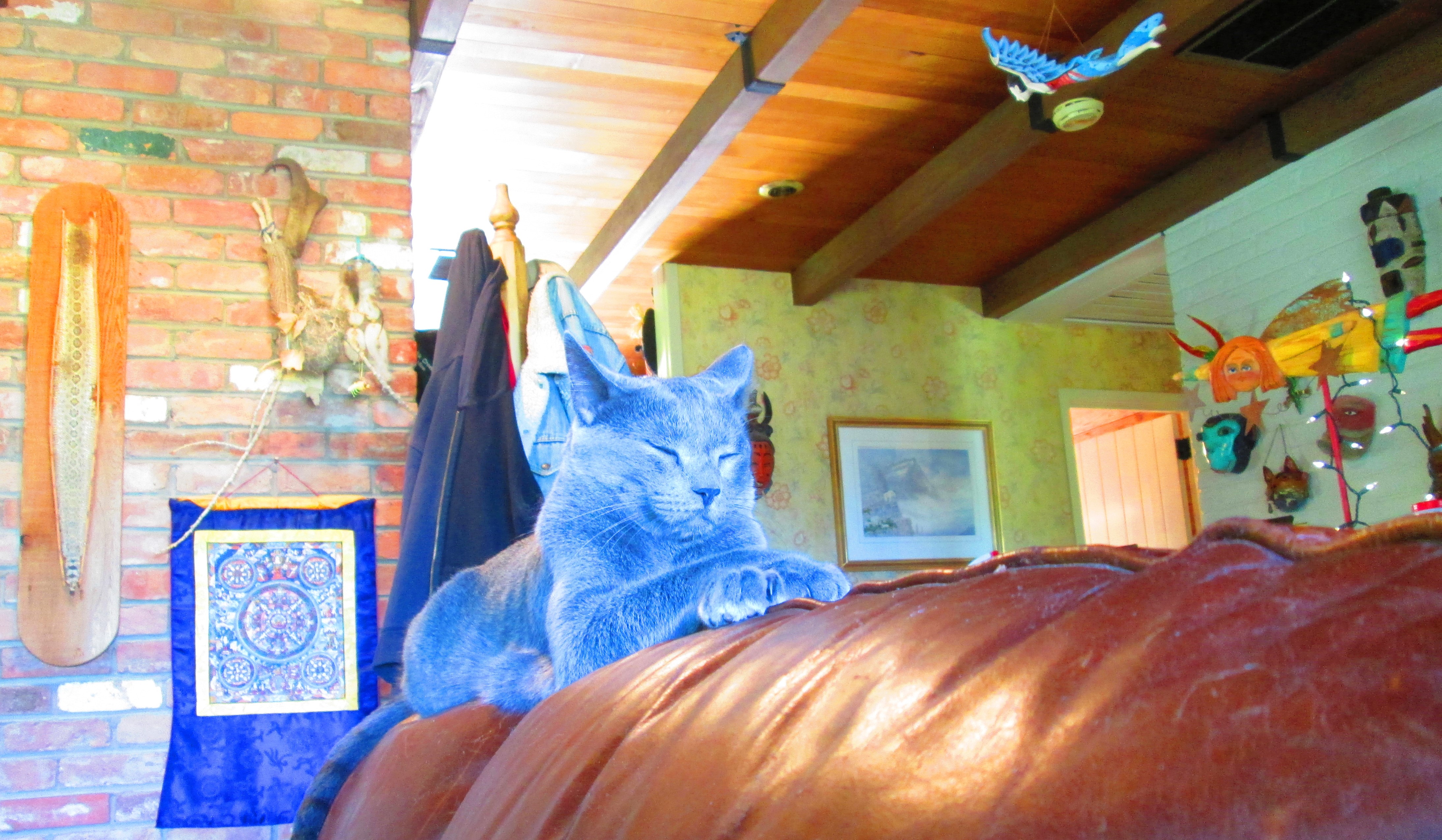 Upon arriving home, pretty much exhausted (I had also done a bicycle workout earlier in the day), Walldough had not moved.  Magnificent beasts such as he are possibly at one with the yooniverse — and if not “at one”, then “at two” with the big U, at least.