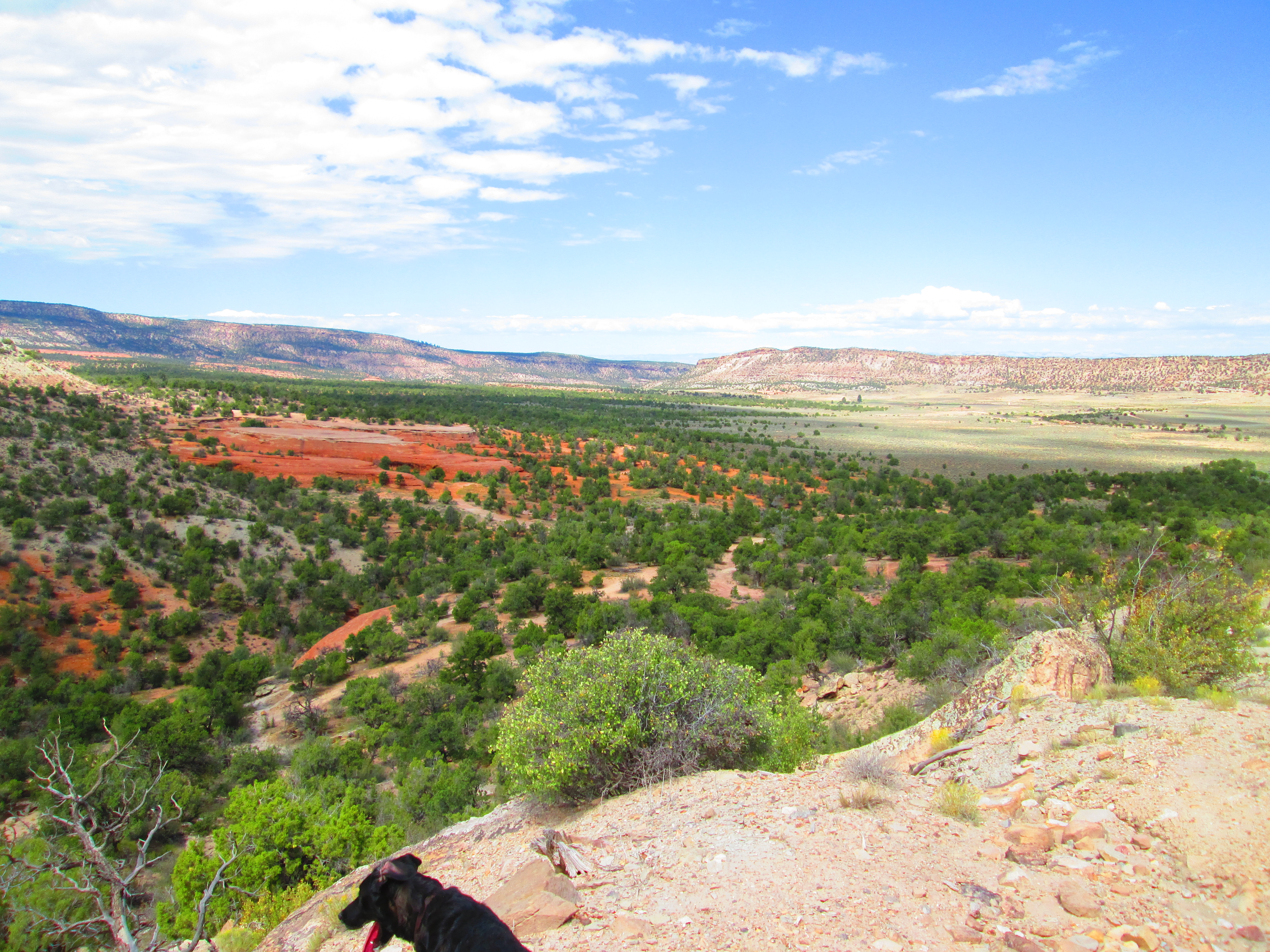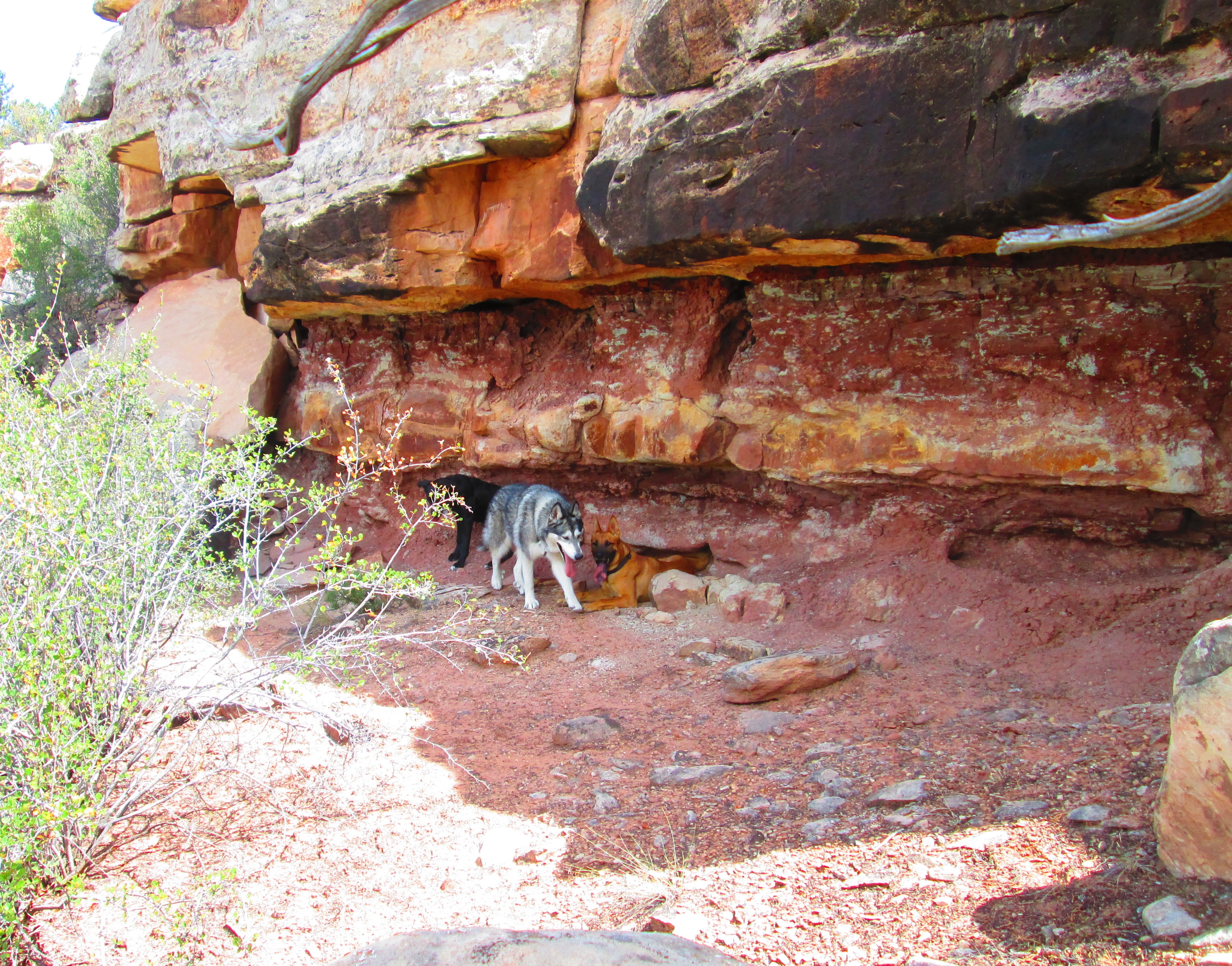 Doggzeneye trekked up, bush-whacked (“schwact”), road-less for a while.  Above, da dorgz have temporarily become cliff-cave dorgz, ‘cept this isn’t much of a cave.  It was a cliff, however.