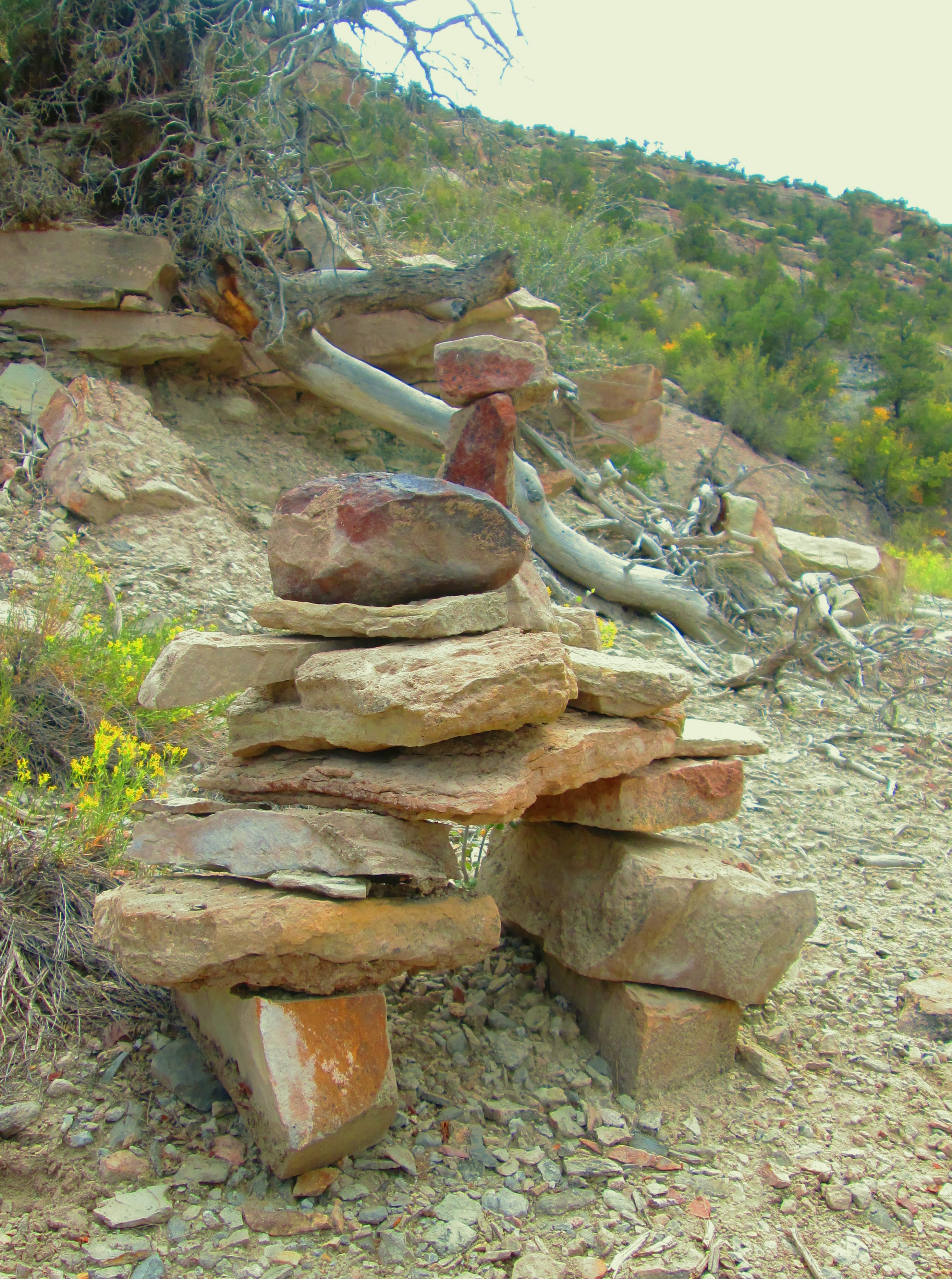 A little while later, we went through a swath of pretty decent flagstone pieces.  It could be that this “road” (and the upper, ‘failed’ road) were constructed to mine or quarry or pick-up-&-carry-off-by-whatever-means-possible flagstone pieces for construction projects down in town.  Probably by mule and/or donkey or indentured illegal immigrant laborers.