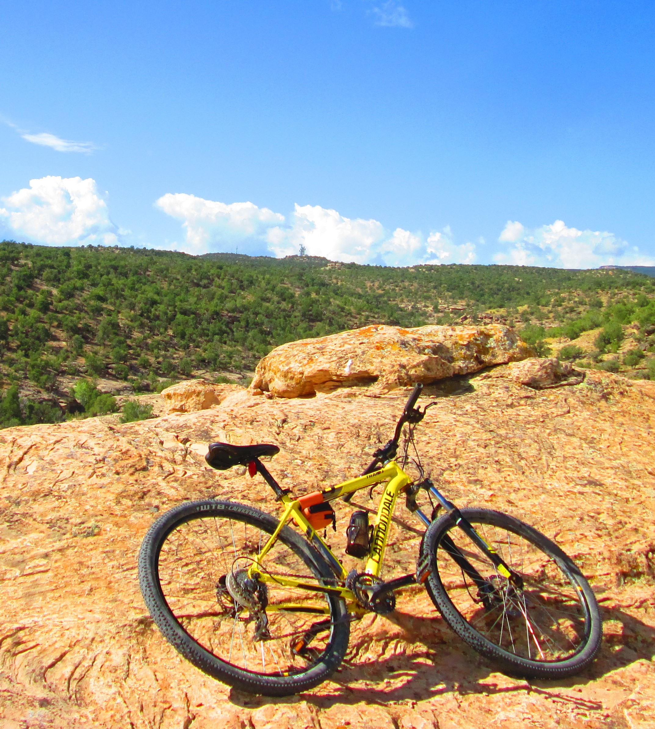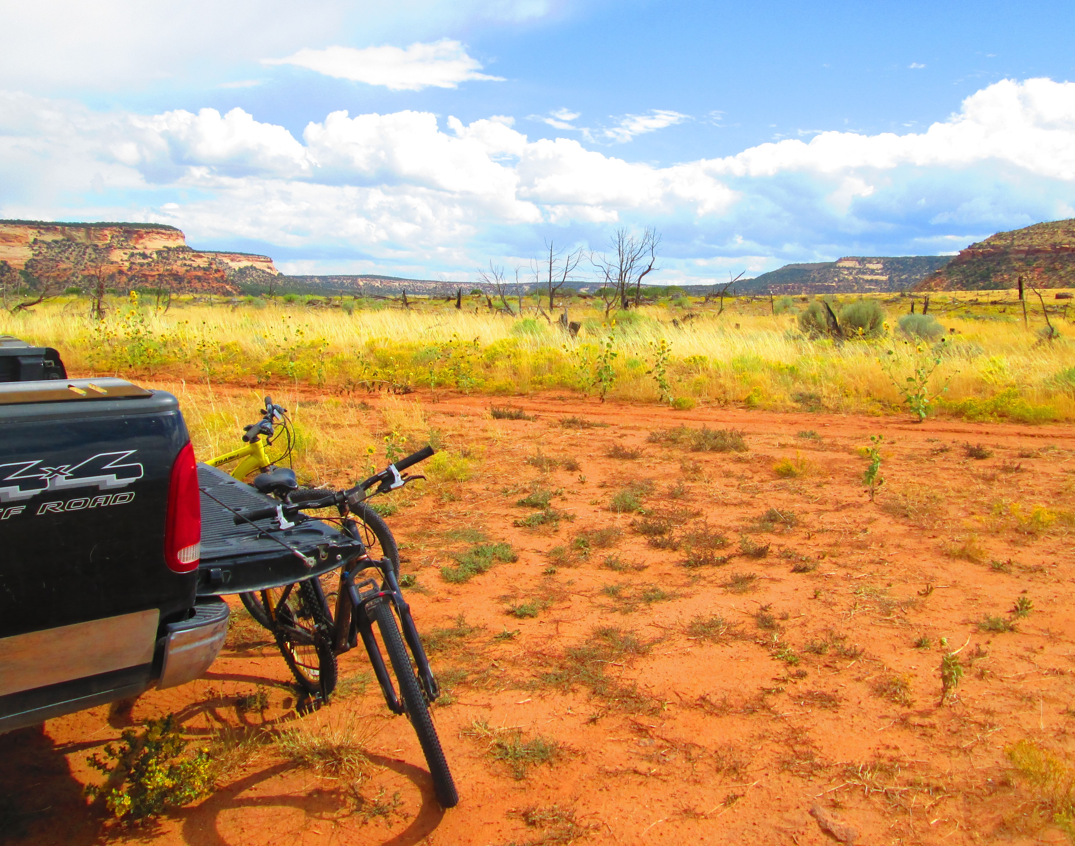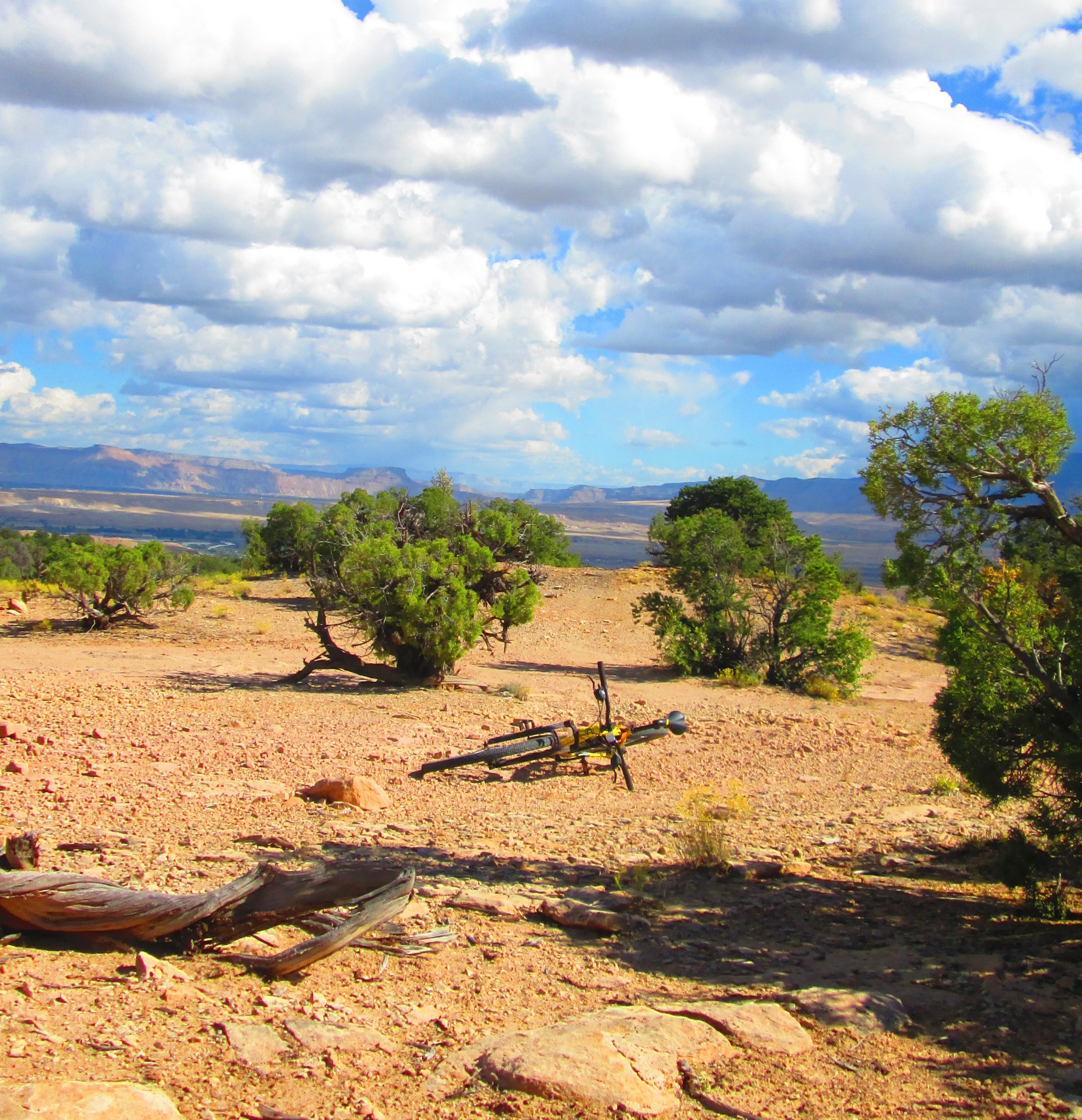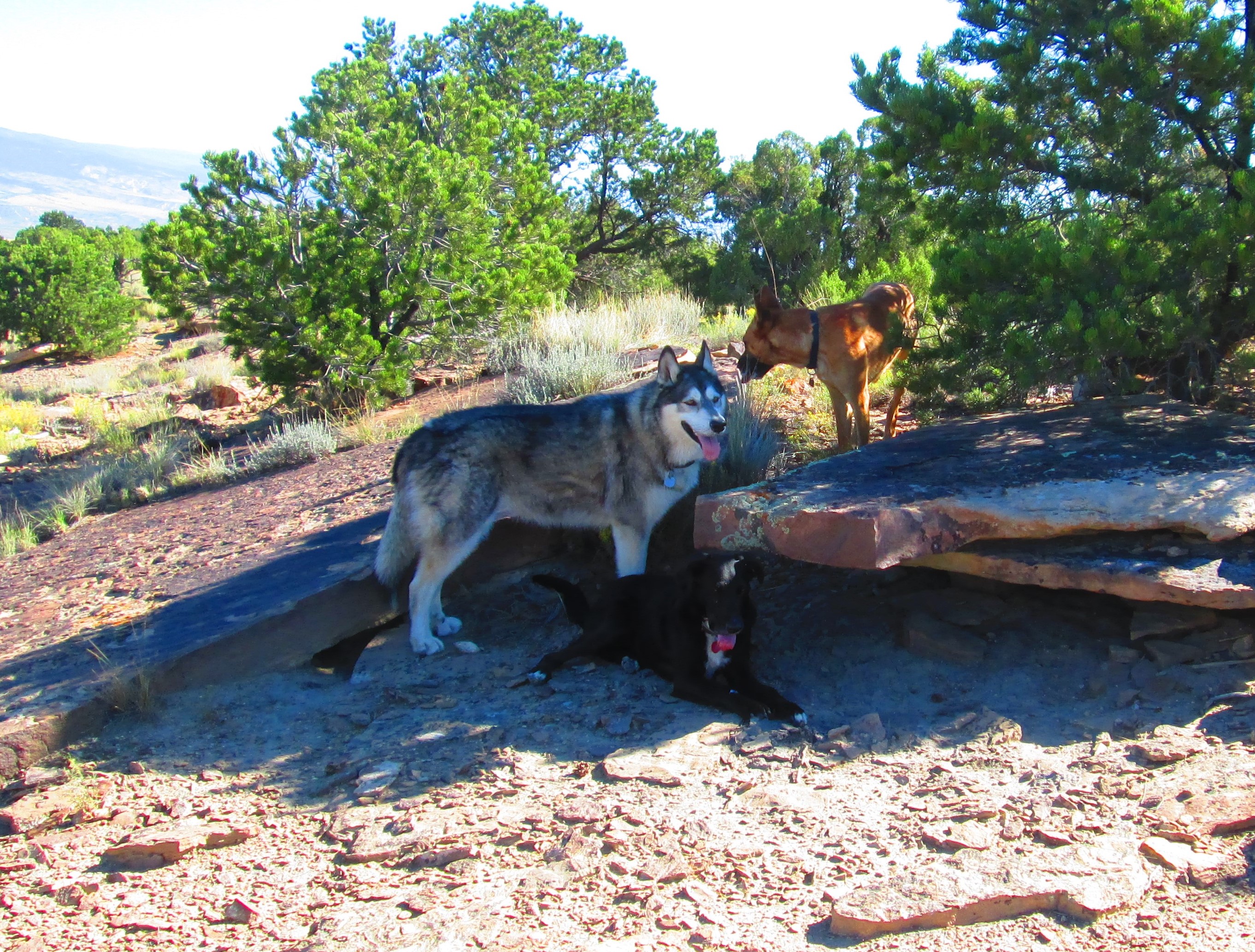 Jake, RockSea, and JaJa pause for a short break during a biking sojourn up above Escalante Rim a few weeks back.  Whew!  (Escal. Rim road climbs about 850′ in a bit more than a mile.  We rode/ran another couple of much easier miles up … pause, then back down).