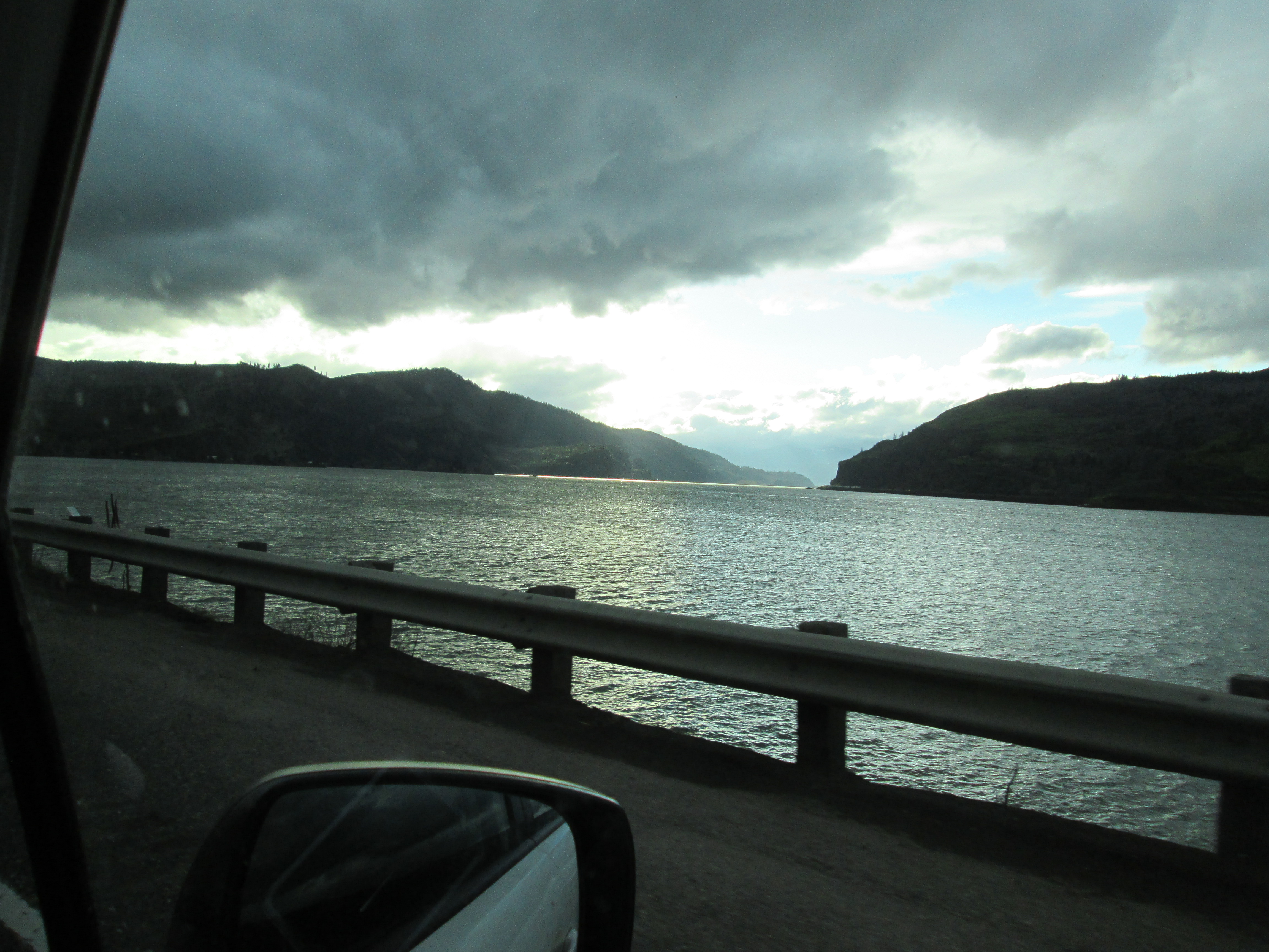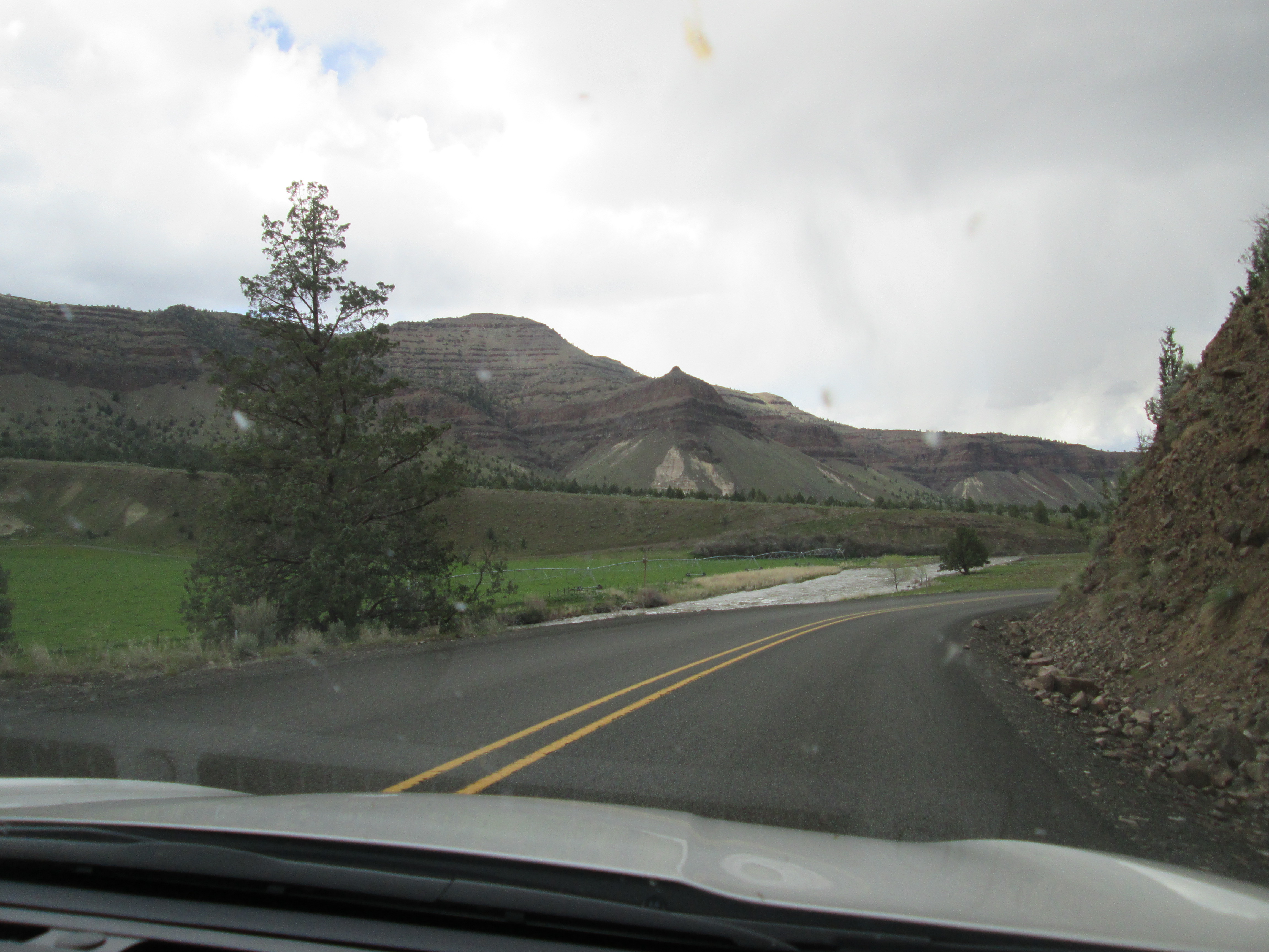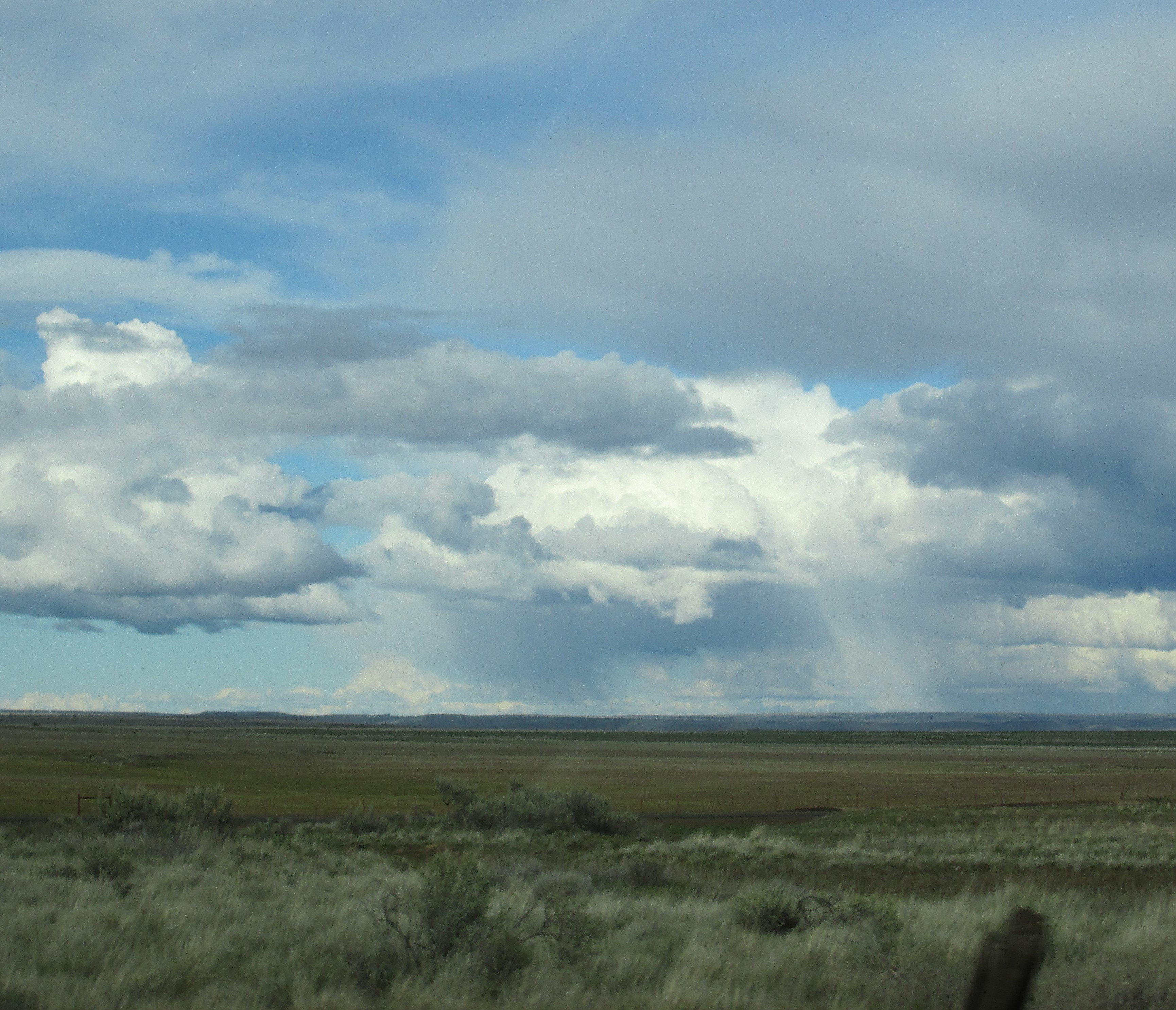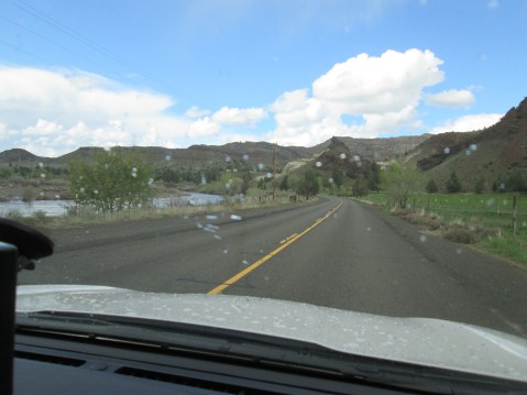 An “un-settled weather” day — in and out of rain-storms, brilliant sun-reflecting clouds, down and along, the John Day River …