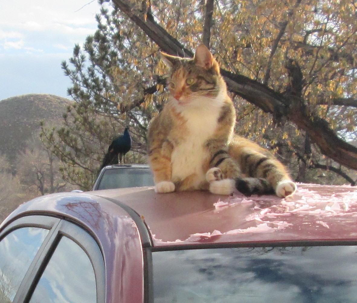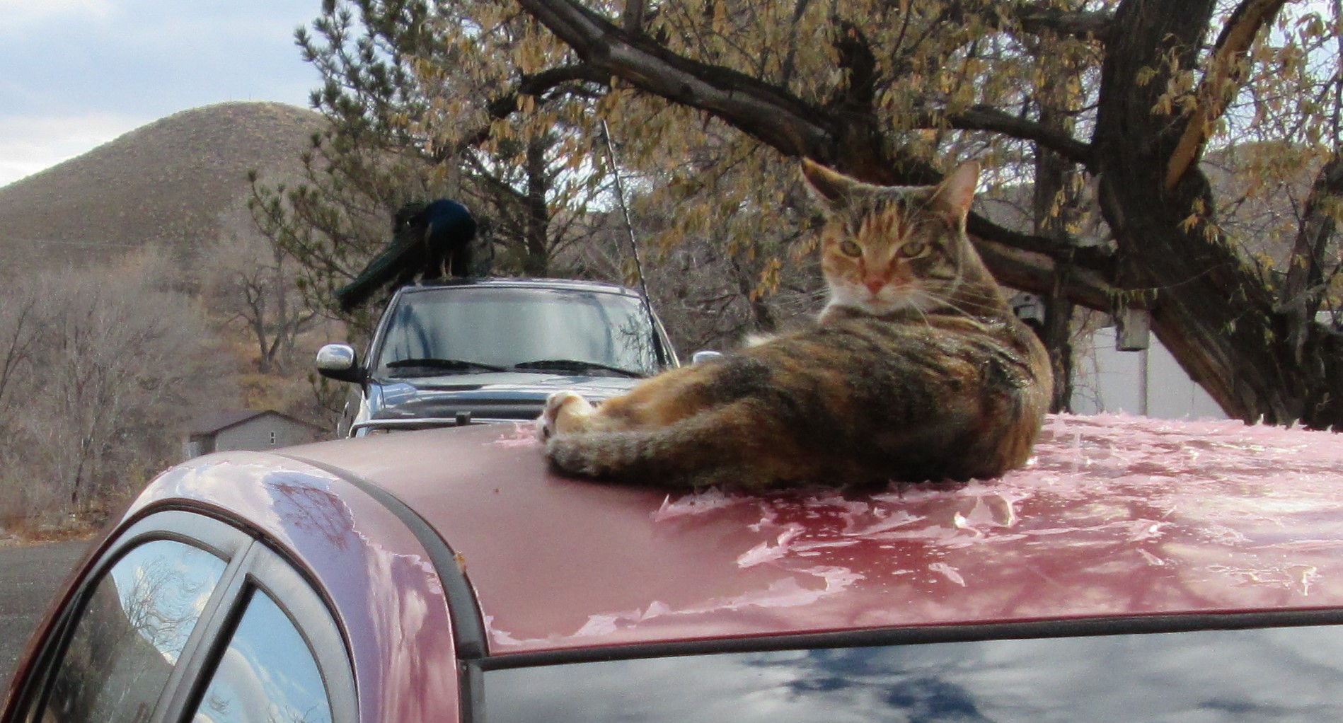 Annie, not necessarily a “cat on a hot tin roof”, but, rather on a cold steel peeling cheap-car rooftop, engages in one of a feline’s favorite activities, the daily anal-orifice warsching.