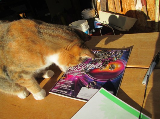Below, she seems to be considering the Scientific American cover — the (probably) never-ending Neutrino Puzzle.