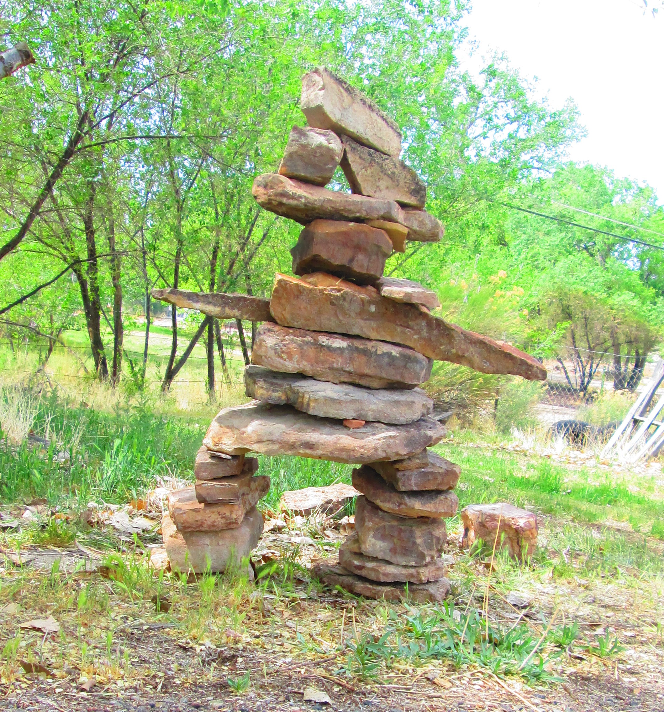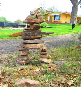 The inukshuk formerly above the pool was blown over during a horrific windstorm, and was re-assembled below the pool. Tho’ it continues to be windy, it still stands …
