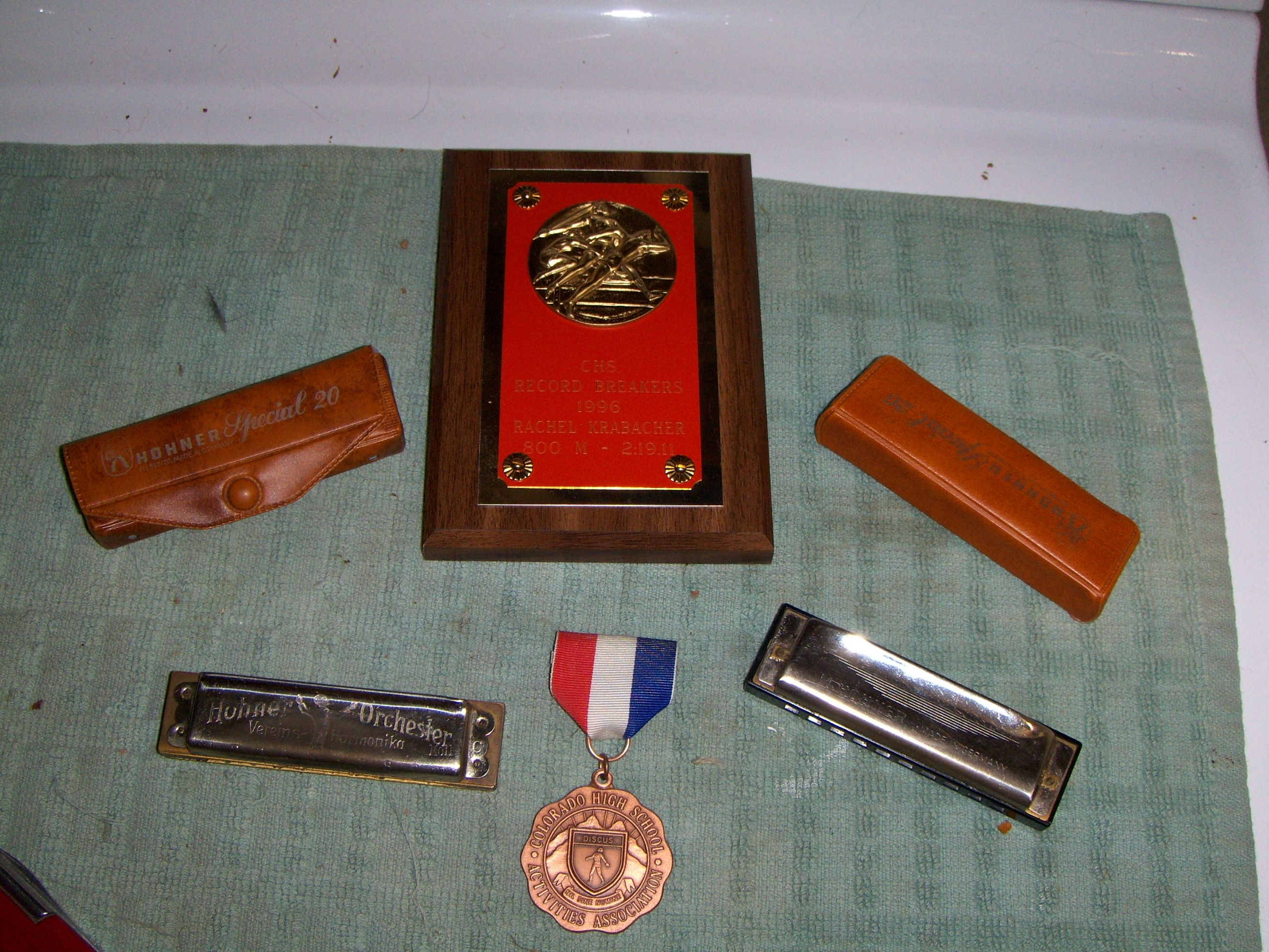 (Above: two of my implements of evil, or auditory destruxion — and my son’s 6th-Place-at-State-Discus-Medal, and a Plaque awarded my daughter for yet another school record (800-meters) )