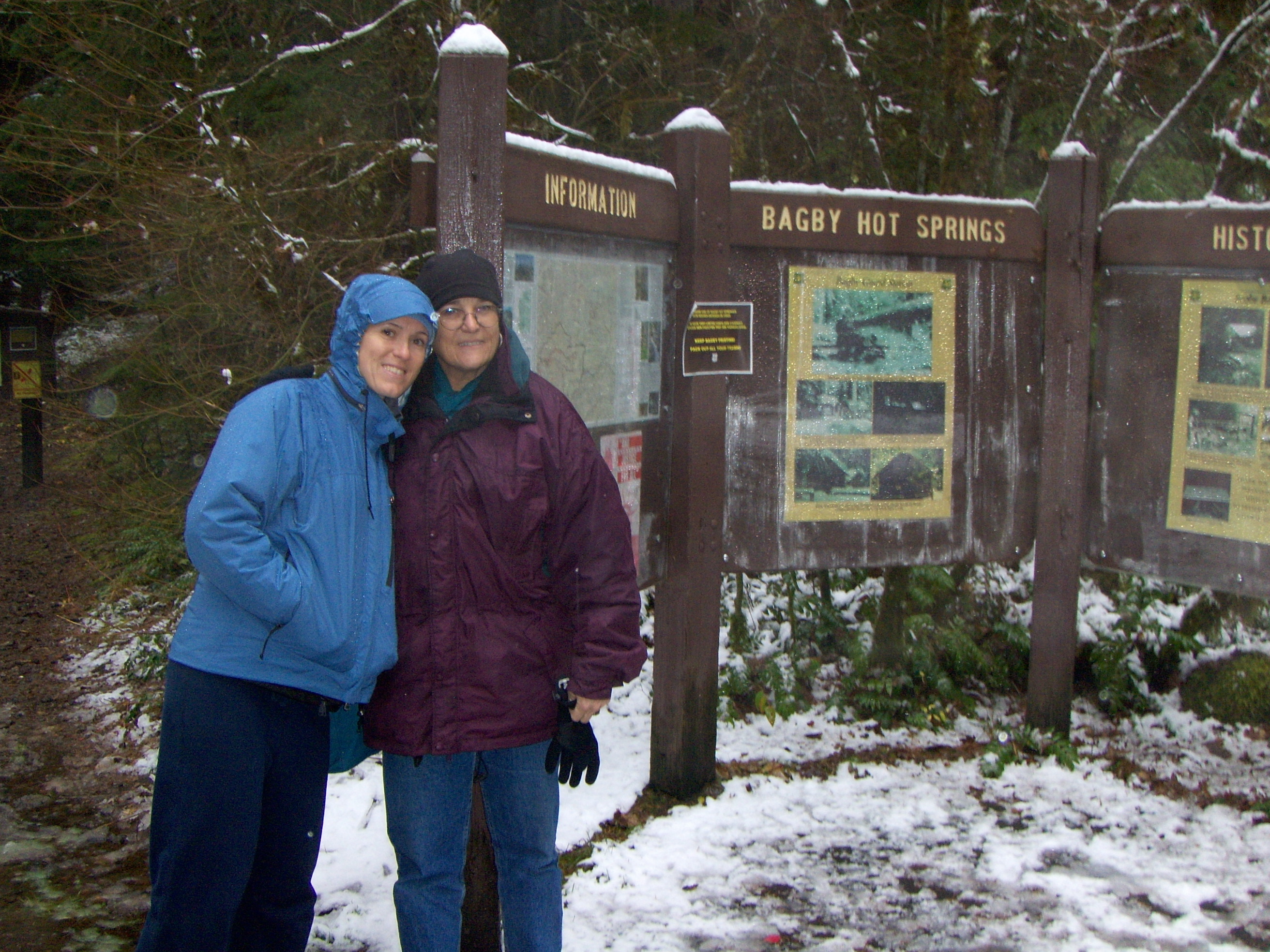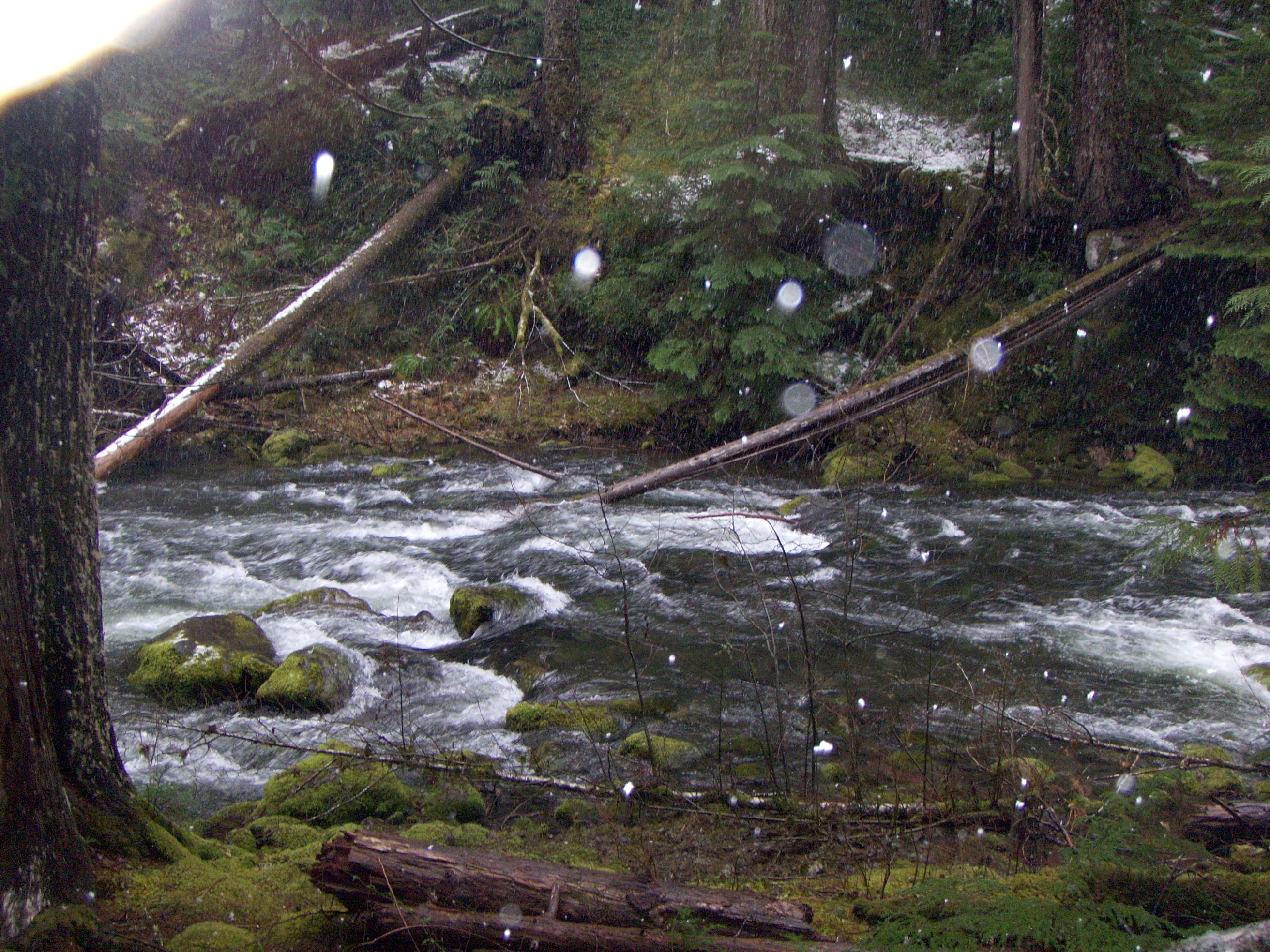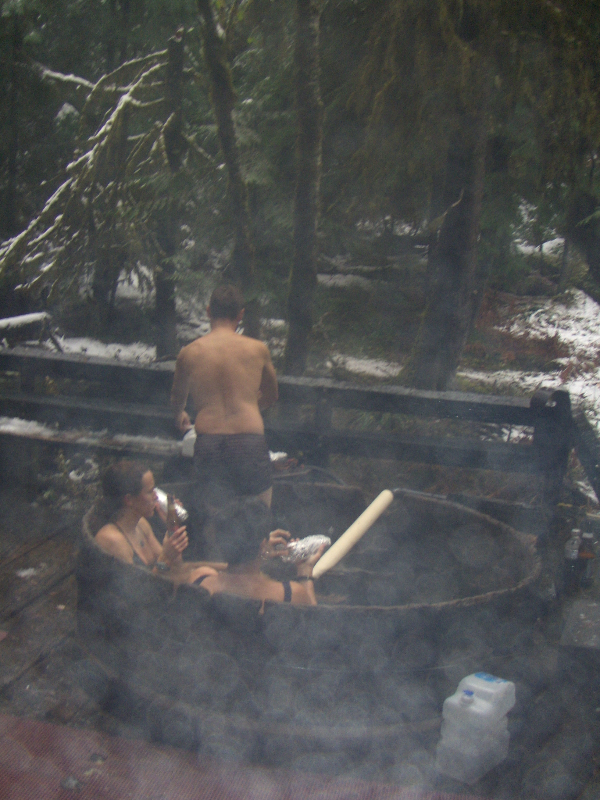 Ben and Raytsch took, pulled, left me on a slorshy foggy forest path along the upper Clackamas. (I KNOW I would have been much much more apprehensive and attentive to my parents under such circumstances!) In spite of frequent reminders of the movie “Romancing the Stone” where our hero(in)es slip-and-fall down a hill thru’ the sheet-flood-rainy hillsides almost to the river below, fortunately I did not slide thru’ the sharp rocks and broken ends of stumps and branches into the 33-degree rushing Clackamas. It was highly possible, verging on probable, however. A good scary adventure and workout. Followed by a verging-on-extradimensional soak in a large hot-tub adjoining a wilderness area further up in the mountains.