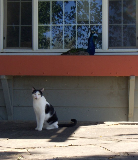 This is one bird, the only bird on the premises, which the cats usually leave alone. Da bird is ensuring that the flower-planter-box on the north side of the house continues to be inhospitable to flowers, as it likes to lounge in the safety and comfort many afternoons there.