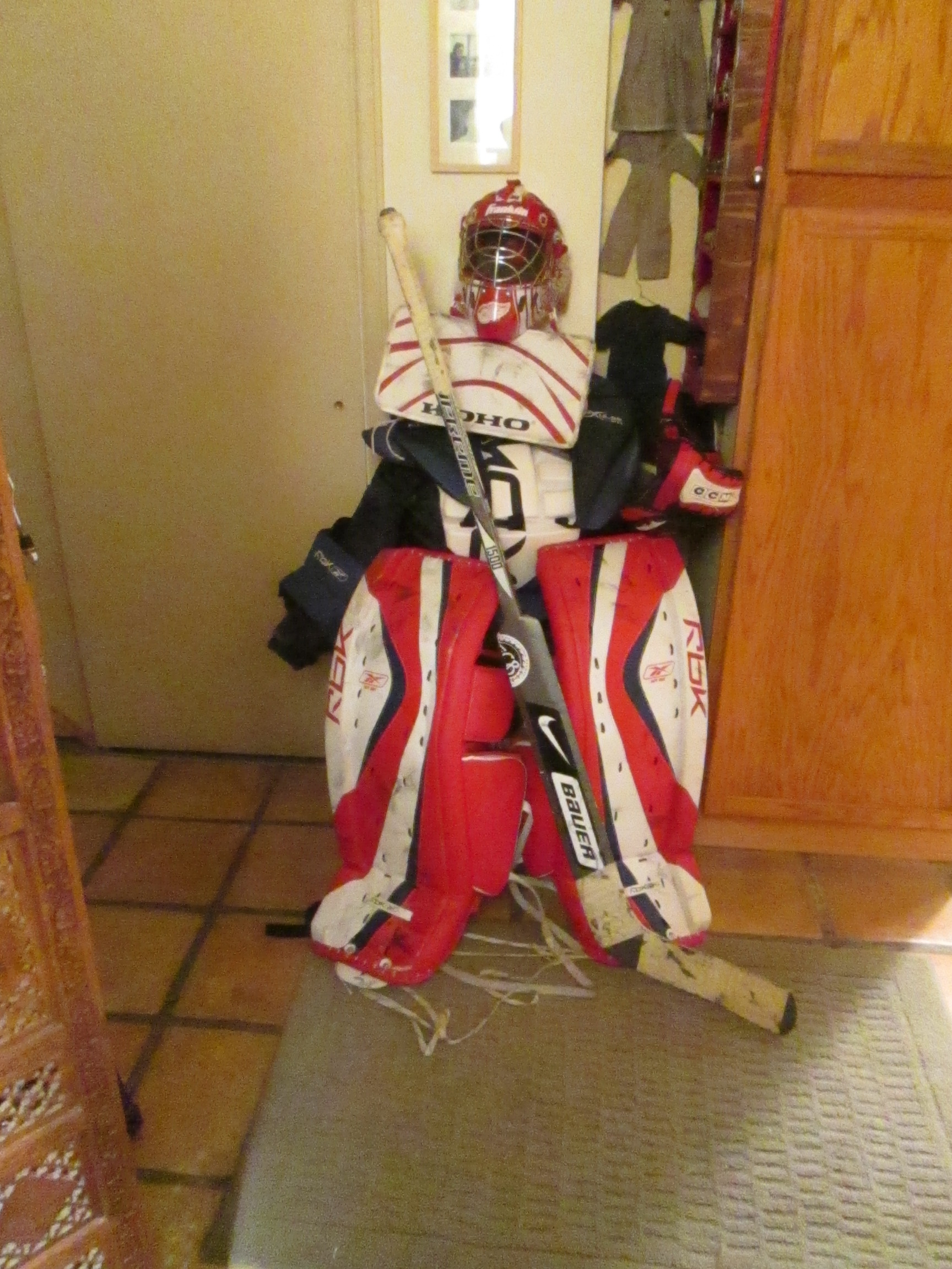 Suiting up would look silly, and probably be confusing to my teammates. (Even though I know “real teams” have a spare goalie, just in case. But in our recreational leagues, I’m fairly sure nobody has a ‘spare’ goalie suit up.) I sat briefly in our locker room, noting that Brandon showed up earlier than his previous game.
