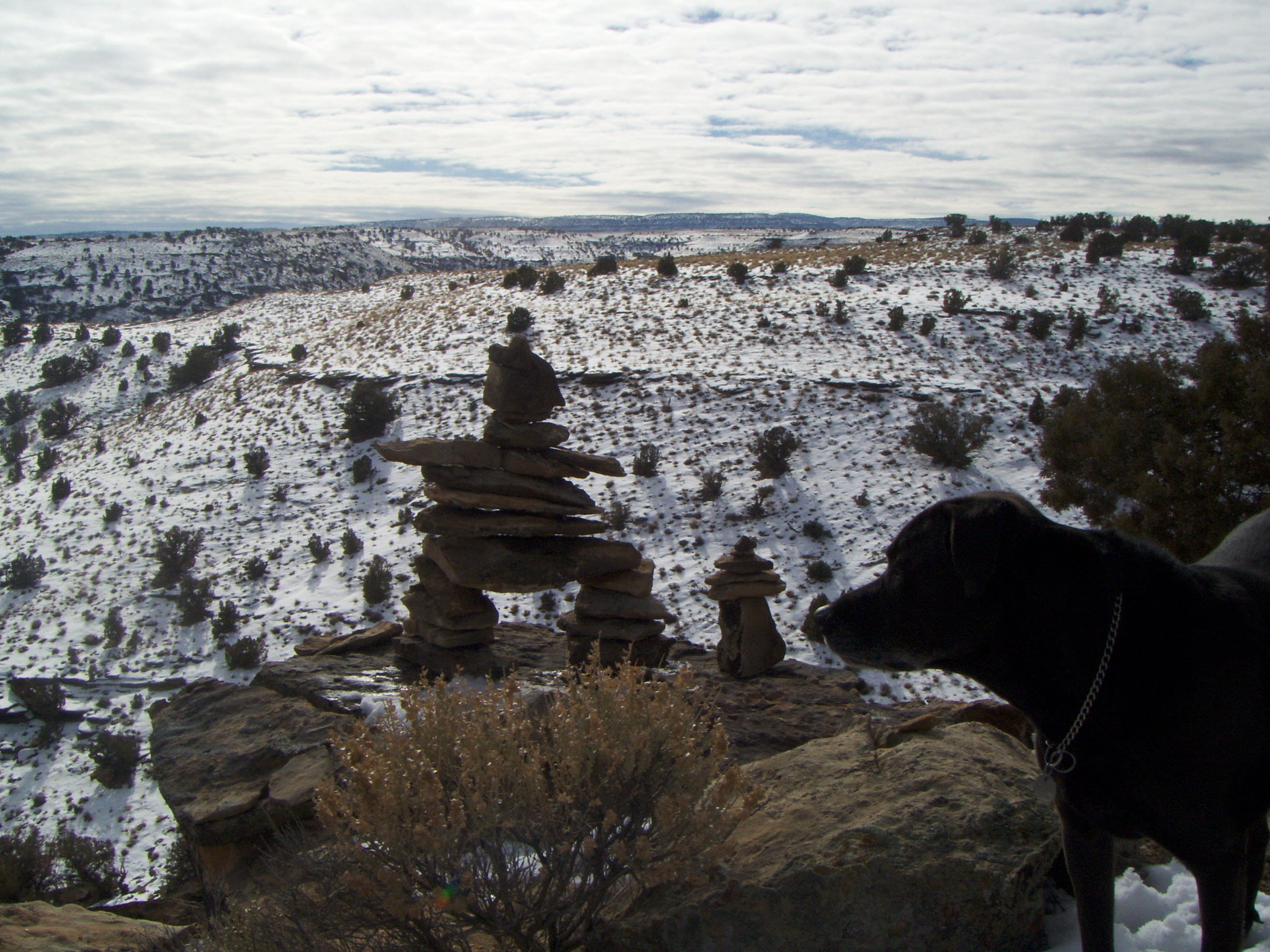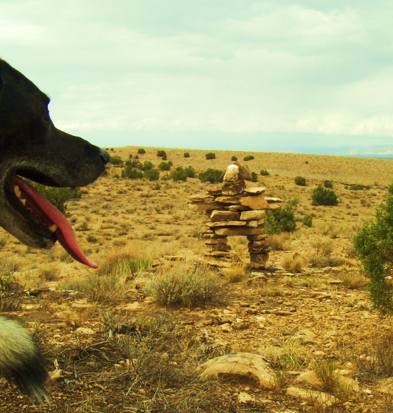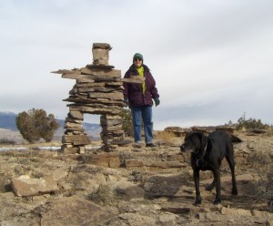 Now wombats are on the back burner. I had been considering, experimenting, constructing ‘test’ inuksuk, or inunnguaq (if one wants to get technical as that is the human form of the Inuit cairn-expression). And about two weeks ago the muse, or the subterranean intradimensional influences, or the mental/psychic/emotional equivalent of a long-overdue quasi-artistic urge, manifested in an inuk manner. I found the spot, the materials were available, an inuksuk assembled itself … with some help from me. The dogs just wandered around sniffing and digging and occasionally checking on me and then wandering off again.