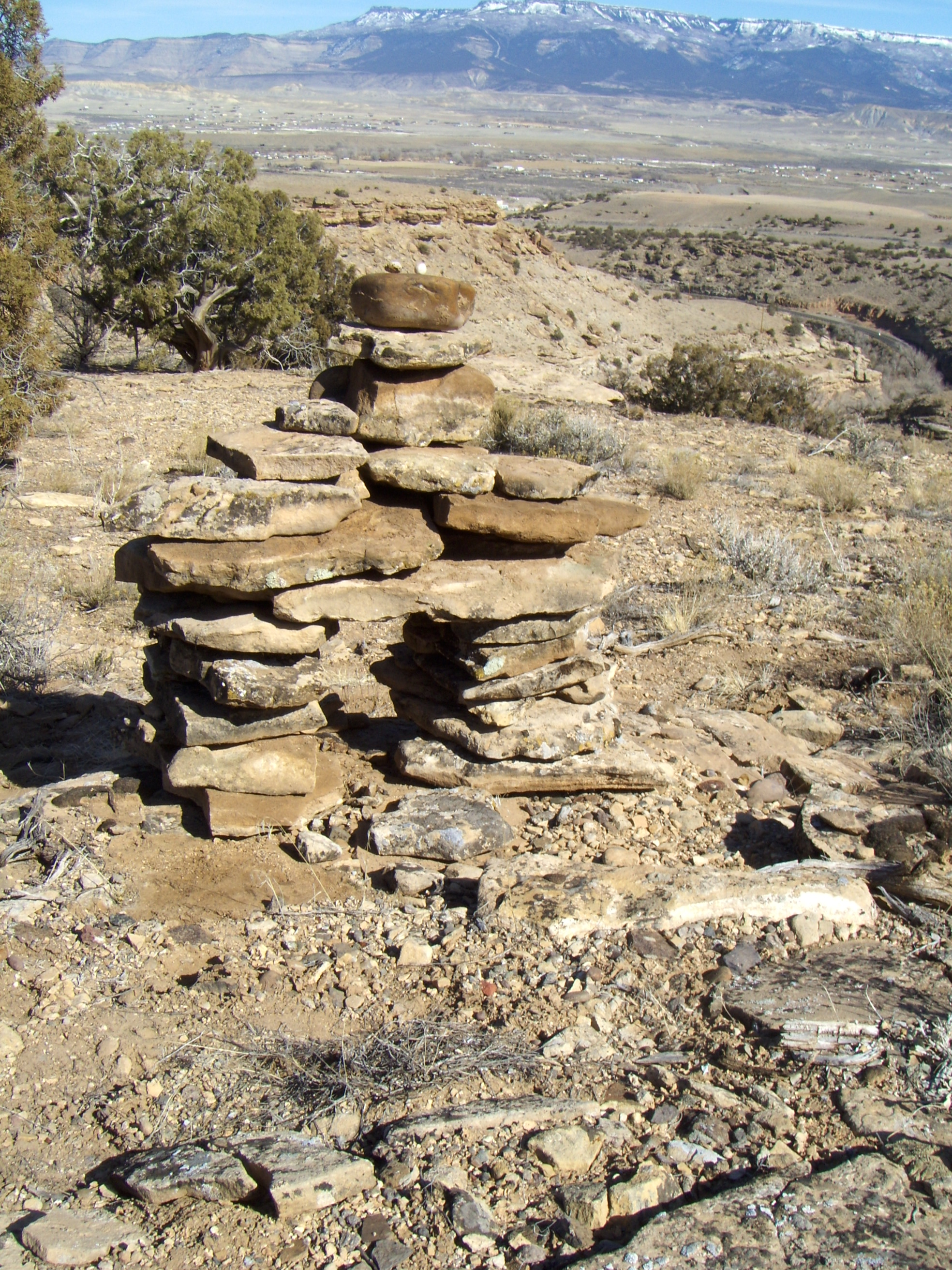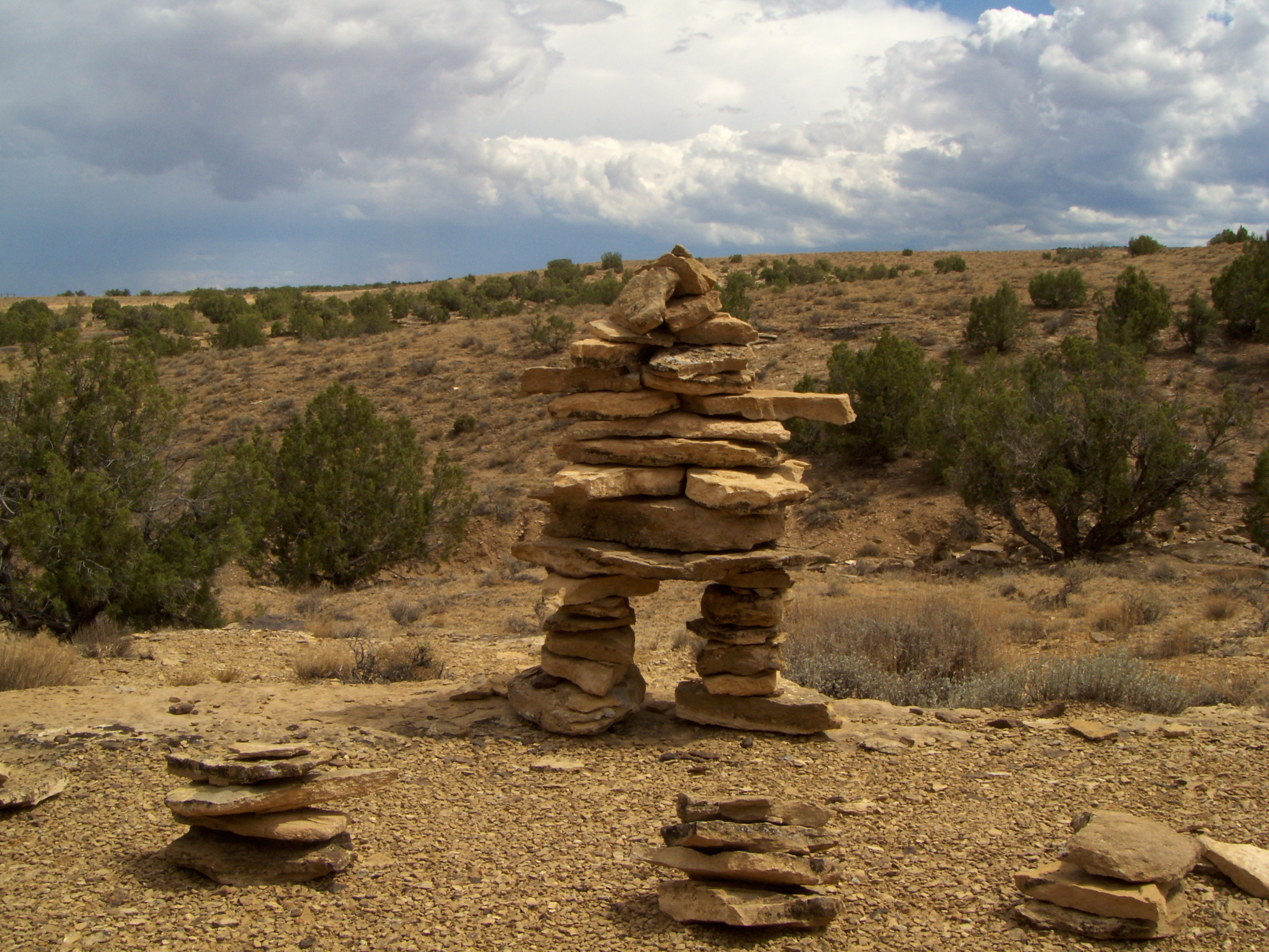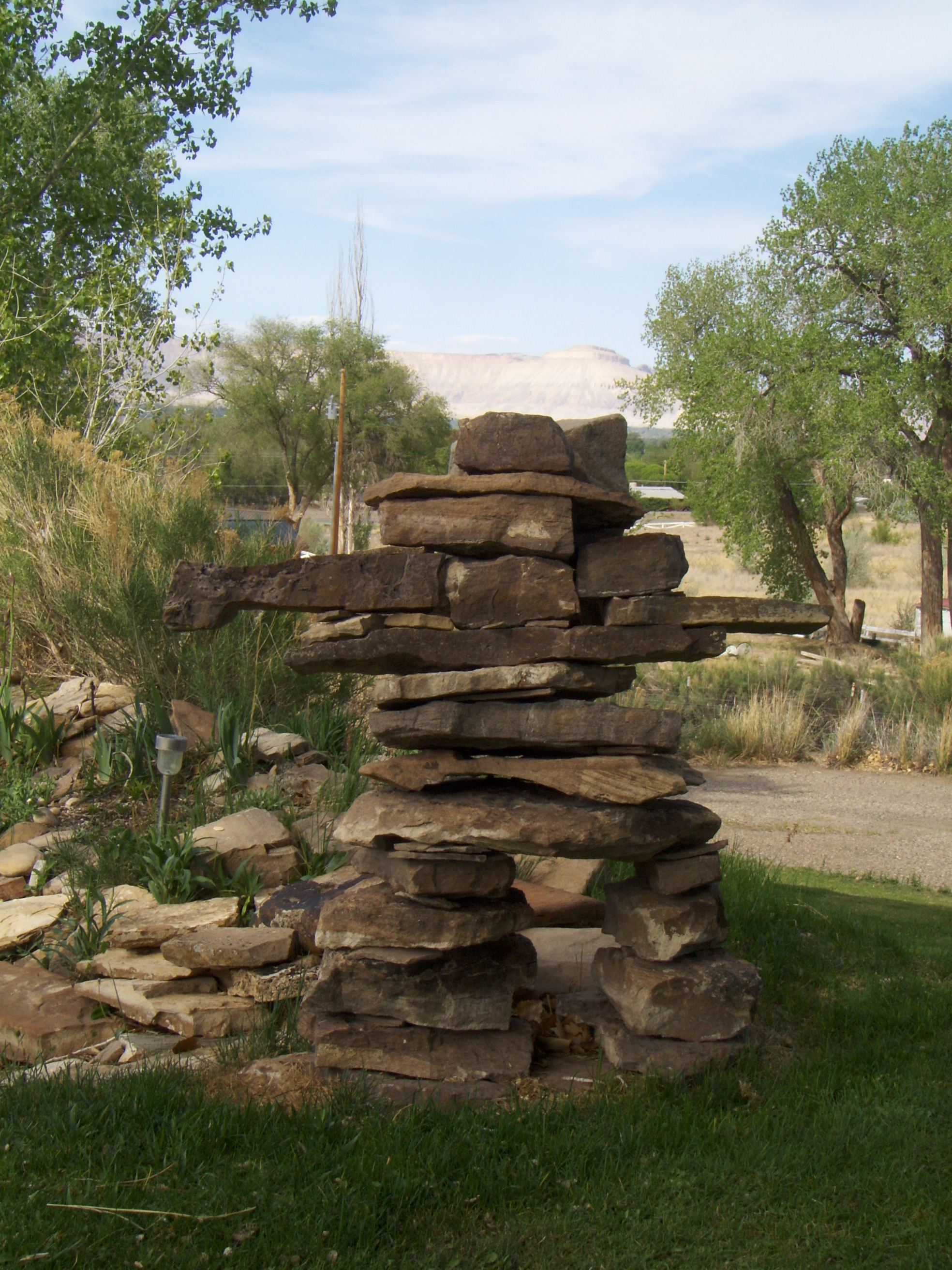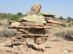 inunnguaq creation by following a process I initiated a couple weeks before. Gather material, pile it around ground zero. Choose big blocky chunks for the feet. These have to be stable! Take care that the leg-pieces are also flat and preferably square-ish. You will need a couple or more large flat ‘body’ pieces to rest on the legs — and not of the inferior quality sandstone which would break to pieces if you dropped it from waist-high. Be sure there are several thin small pieces for shims and ‘chinking.’ Take care to locate strong and long rectangular rocks for the arms. Enough solid preferably cubic blocks for the upper body and to weigh down the shoulders. A collar-bone section, upon which the neck pieces and, finally, the head can securely rest.