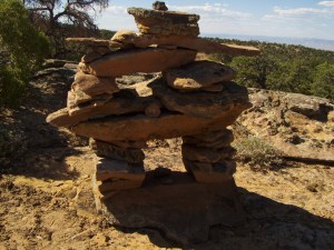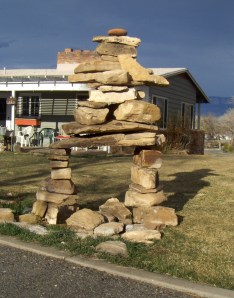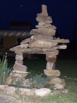 Periodically, rock the structure-in-progress gently with one hand and note where shims or ‘chink’ pieces should be inserted to dampen sway. You do want this to withstand a windstorm, not to mention death by bird-perch. Granted, if a cow were to bump into it … I’d need either a half-dozen labor crew and/or construction machinery to make an inuksuk that large!
