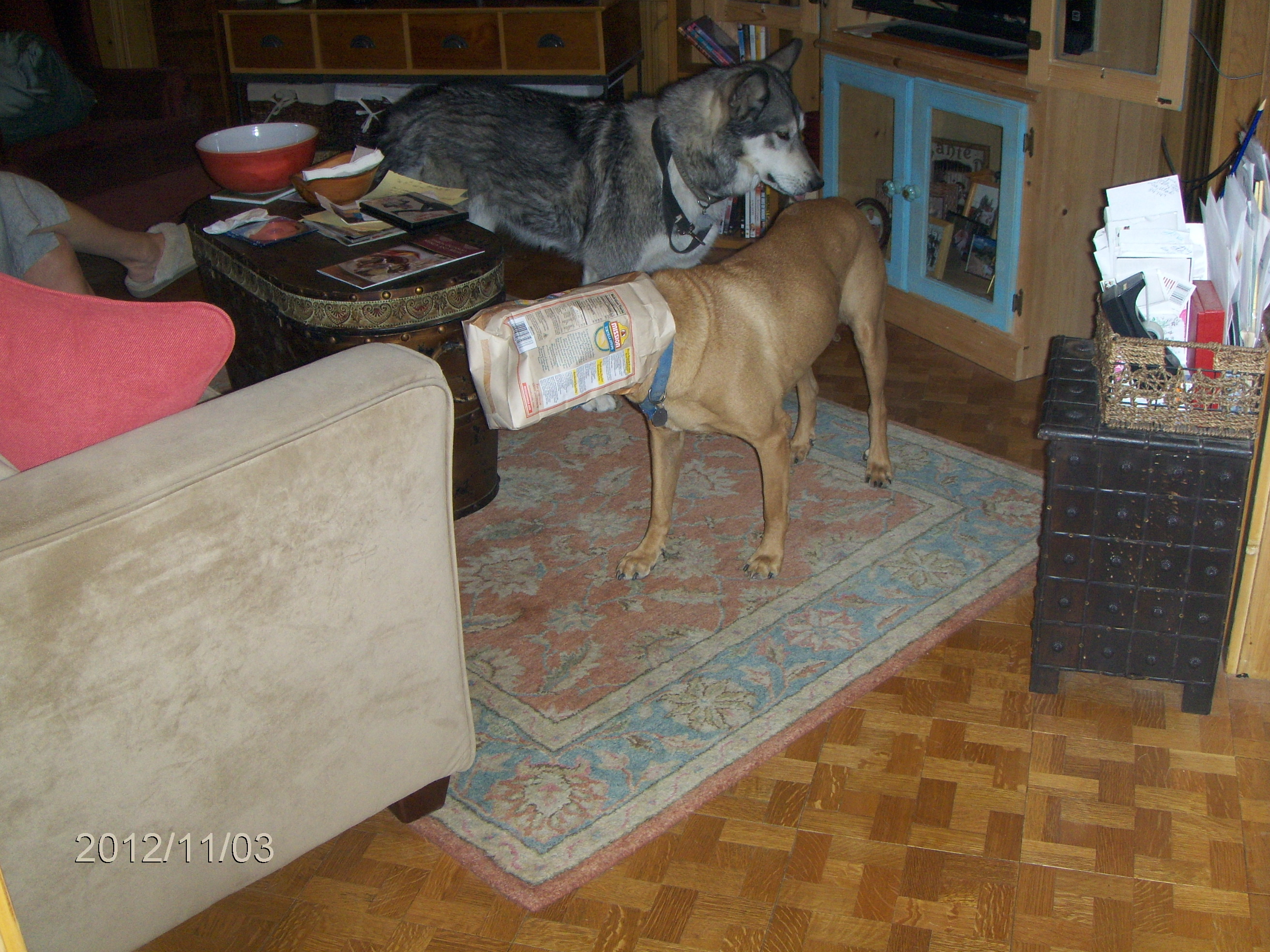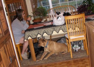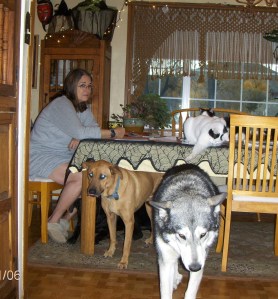 Wolf-Mother doing what comes naturally. Note the three dawgz under the table, and two cats atop.